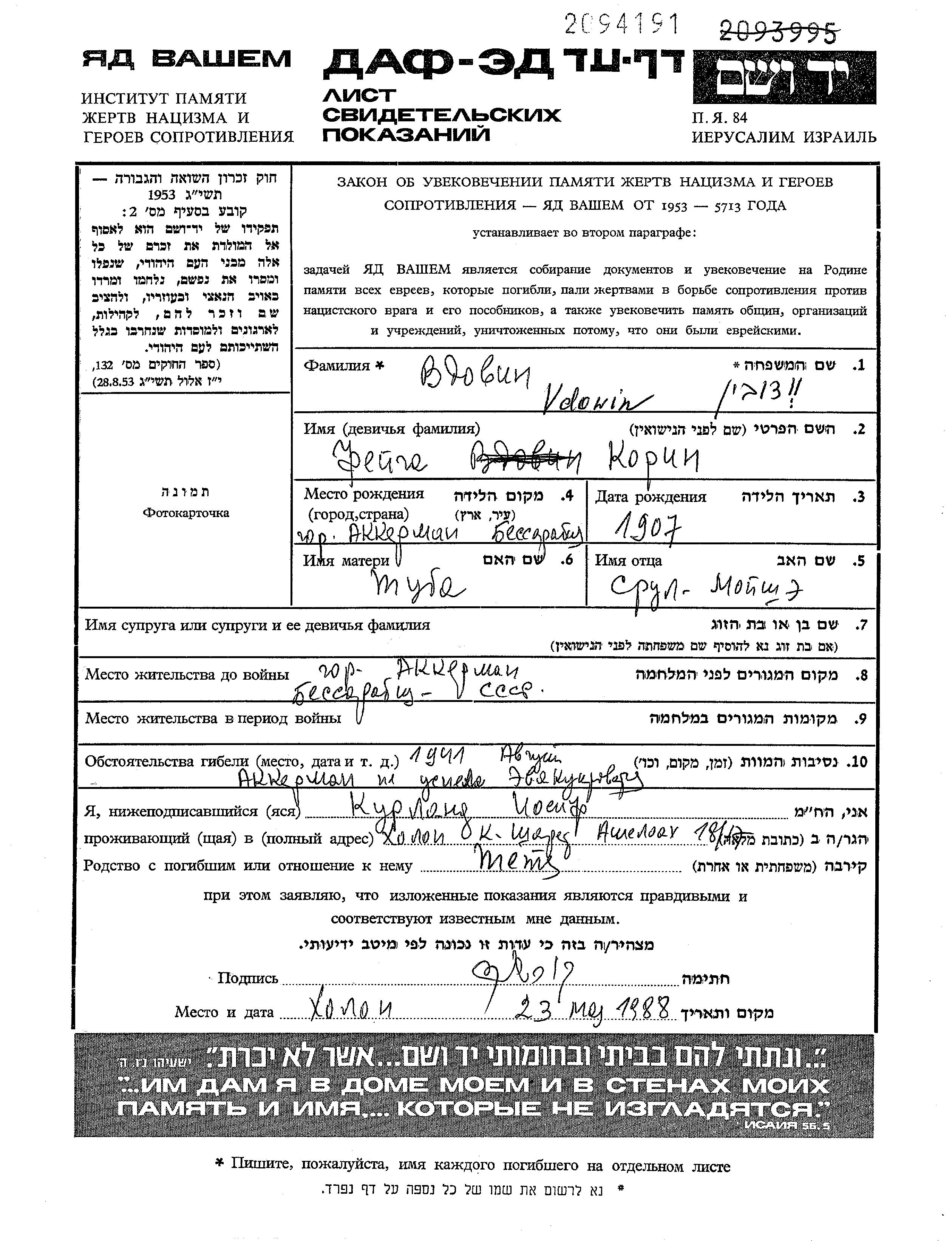 Яд Вашем - Листы свидетельских показаний Мемориального фонда