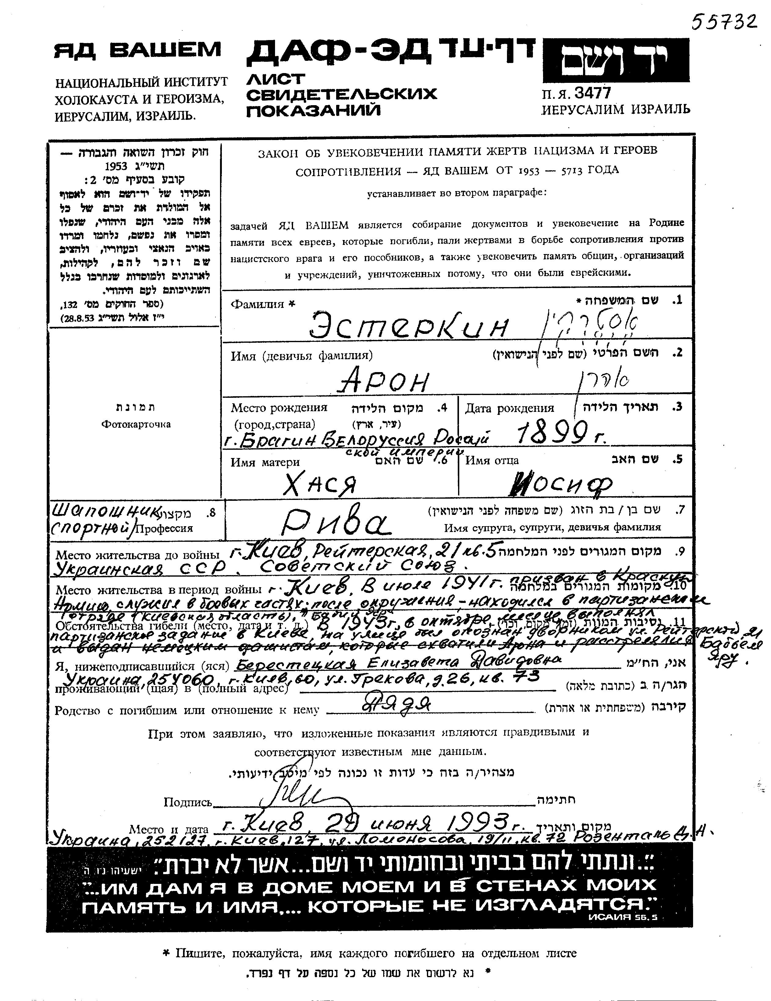 Эстеркин Арон 1899 Киев, Украина (СССР) Лист свидетельских показаний