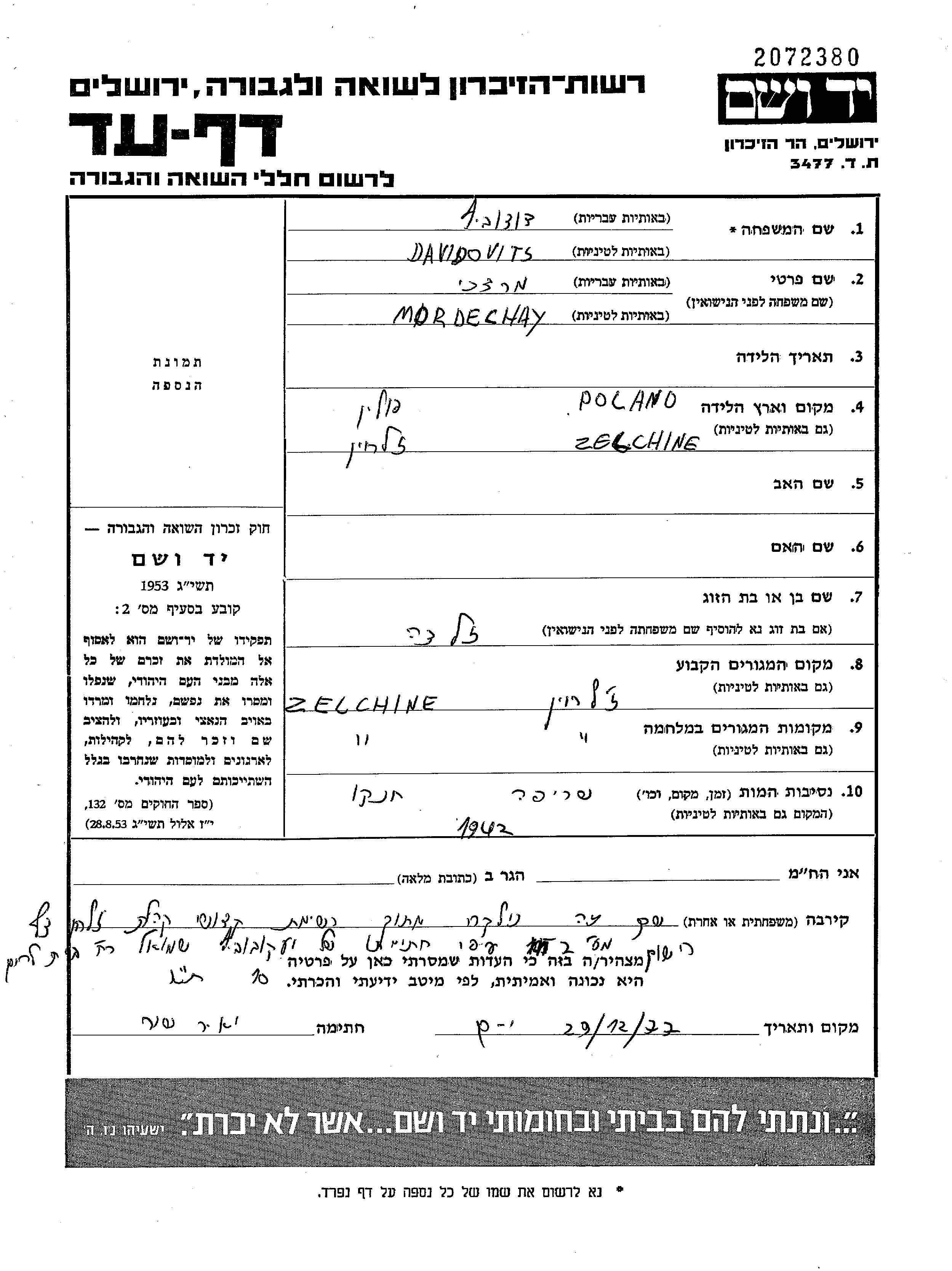 Мордехай Давидовиц, место рождения: Жихлин, Польша. Женат / замужем. Место жительства до войны: Жихлин, Польша. Место во время войны: Жихлин, Польша.