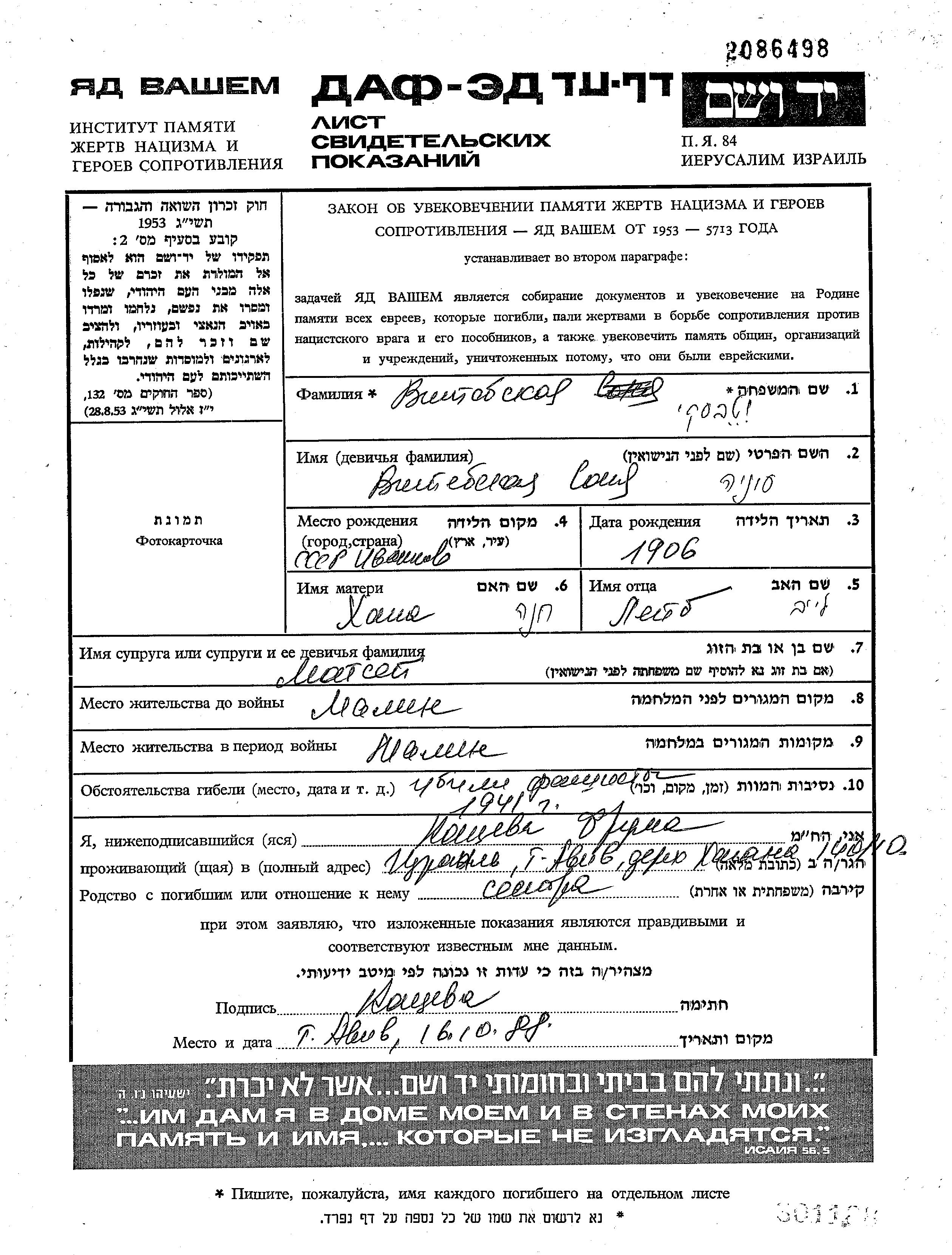 Витебский Соня 1906 Малин, Украина (СССР) Лист свидетельских показаний