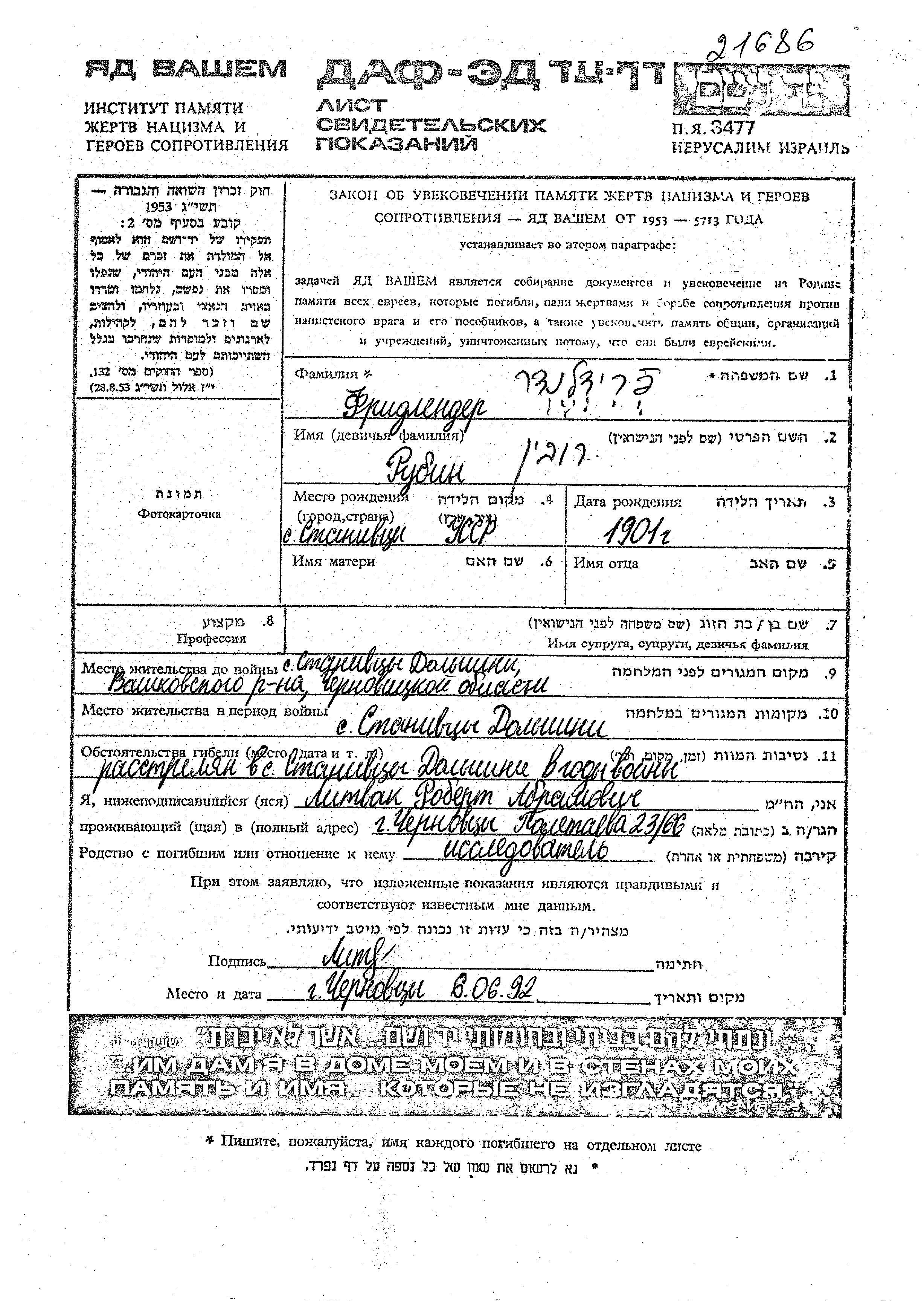 Фридлендер Рубин 1901 Становцы Доль, Румыния Лист свидетельских показаний