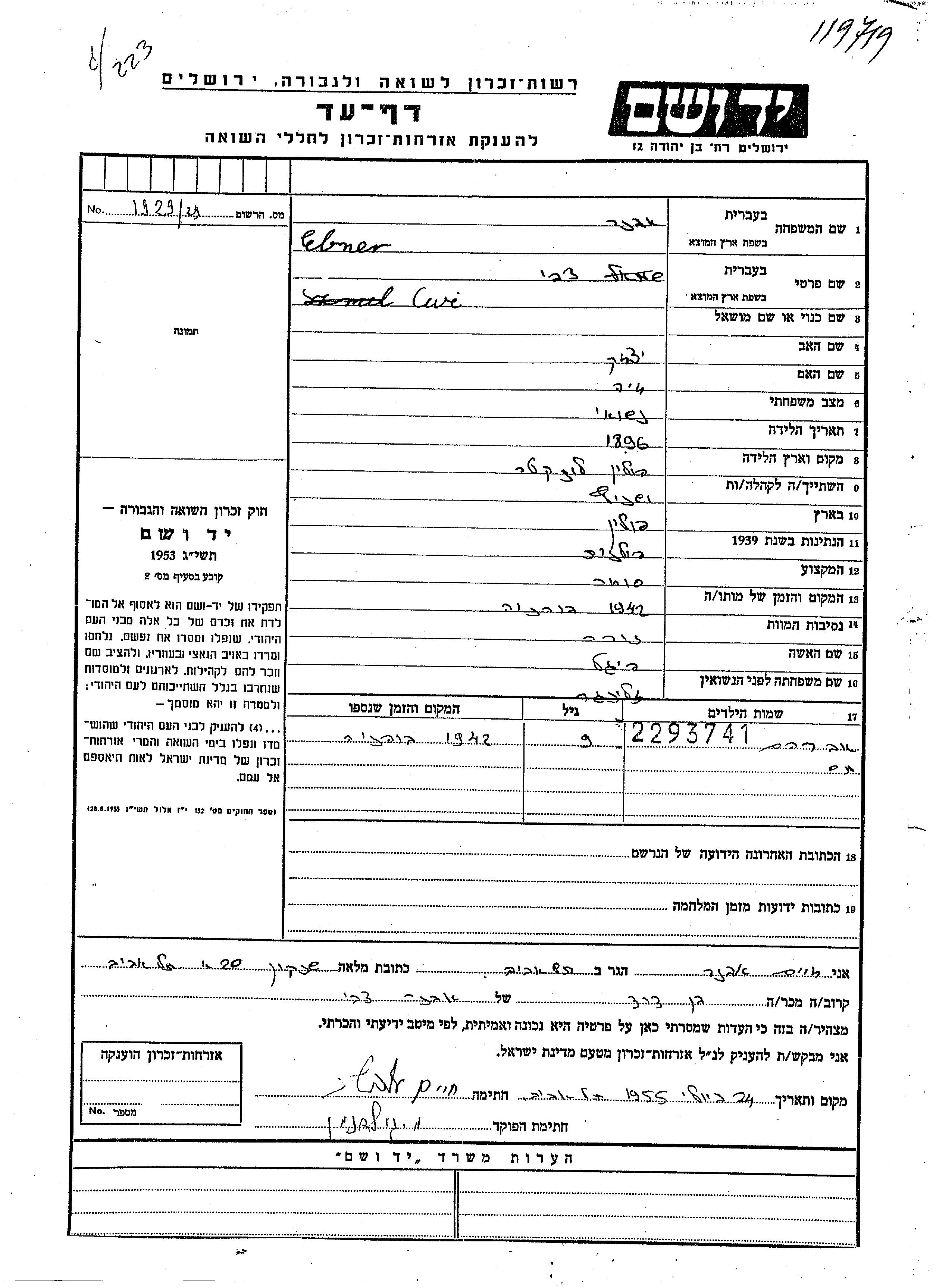 Эбнер Авнер Абраам 1933 Вишнич, Польша Лист свидетельских показаний