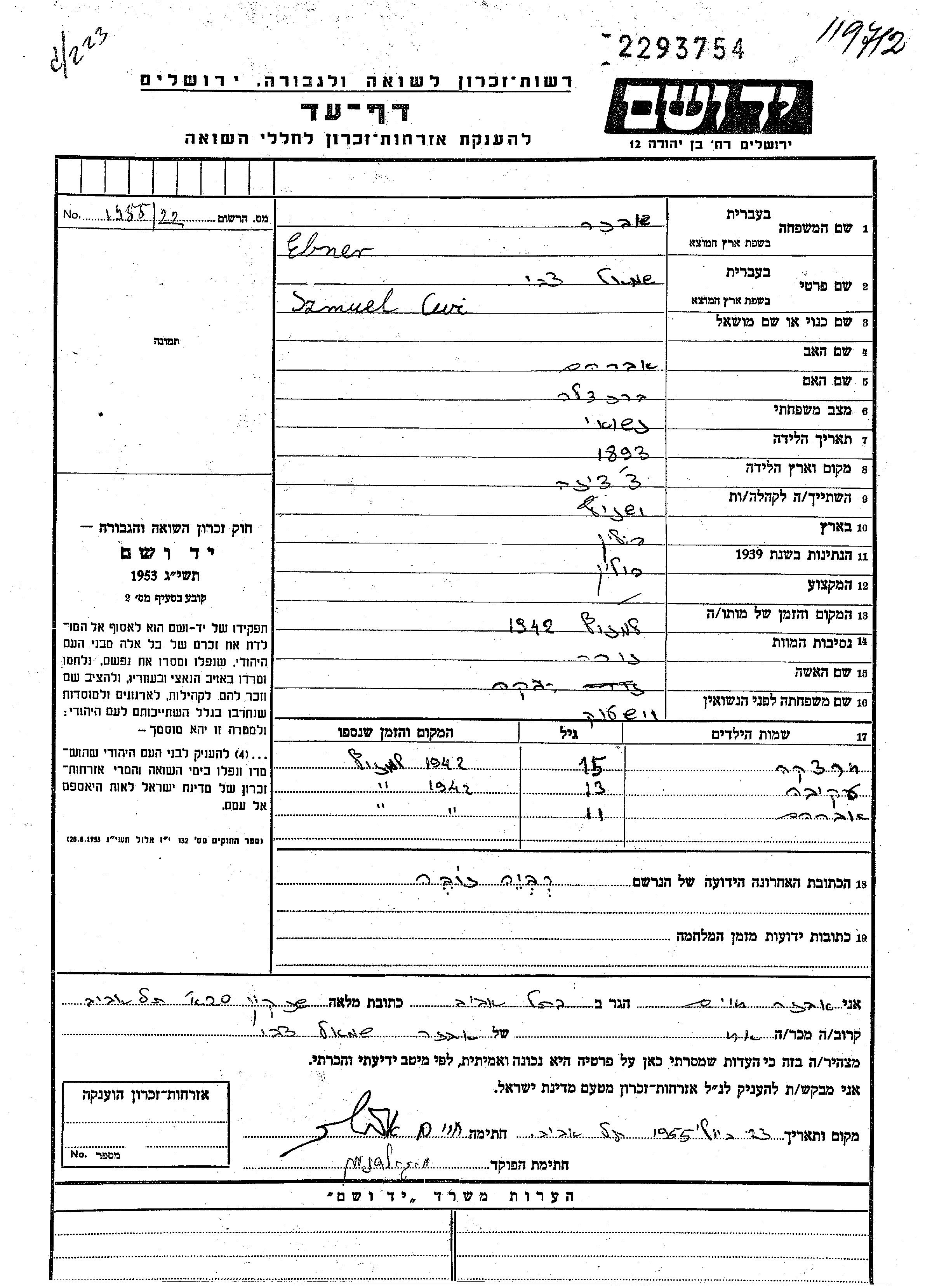 Шмуэль Цви Эбнер Авнер, место рождения: Ценцина, Польша. Отец: Абраам, mать:Брандла. Женат / замужем. Место жительства до войны: Вишнич, Польша. Место во время войны: Rybie Nowe, Польша.