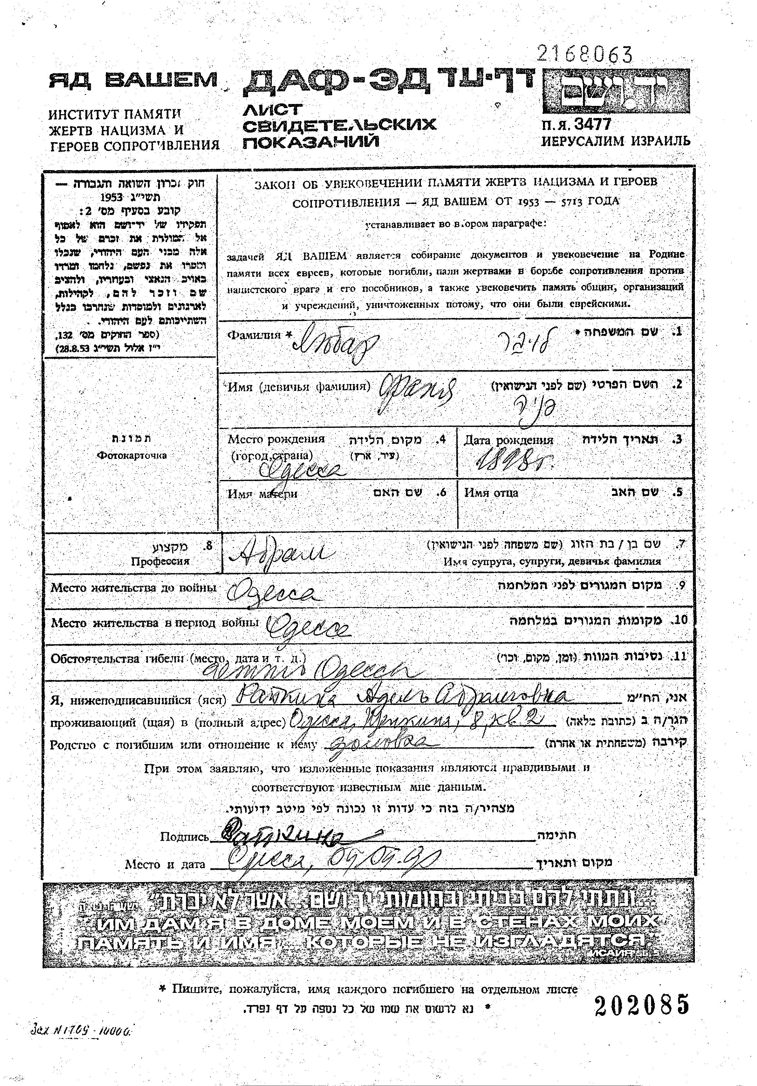 Любар Лобер Фаня 1898 Одесса, Украина (СССР) Лист свидетельских показаний