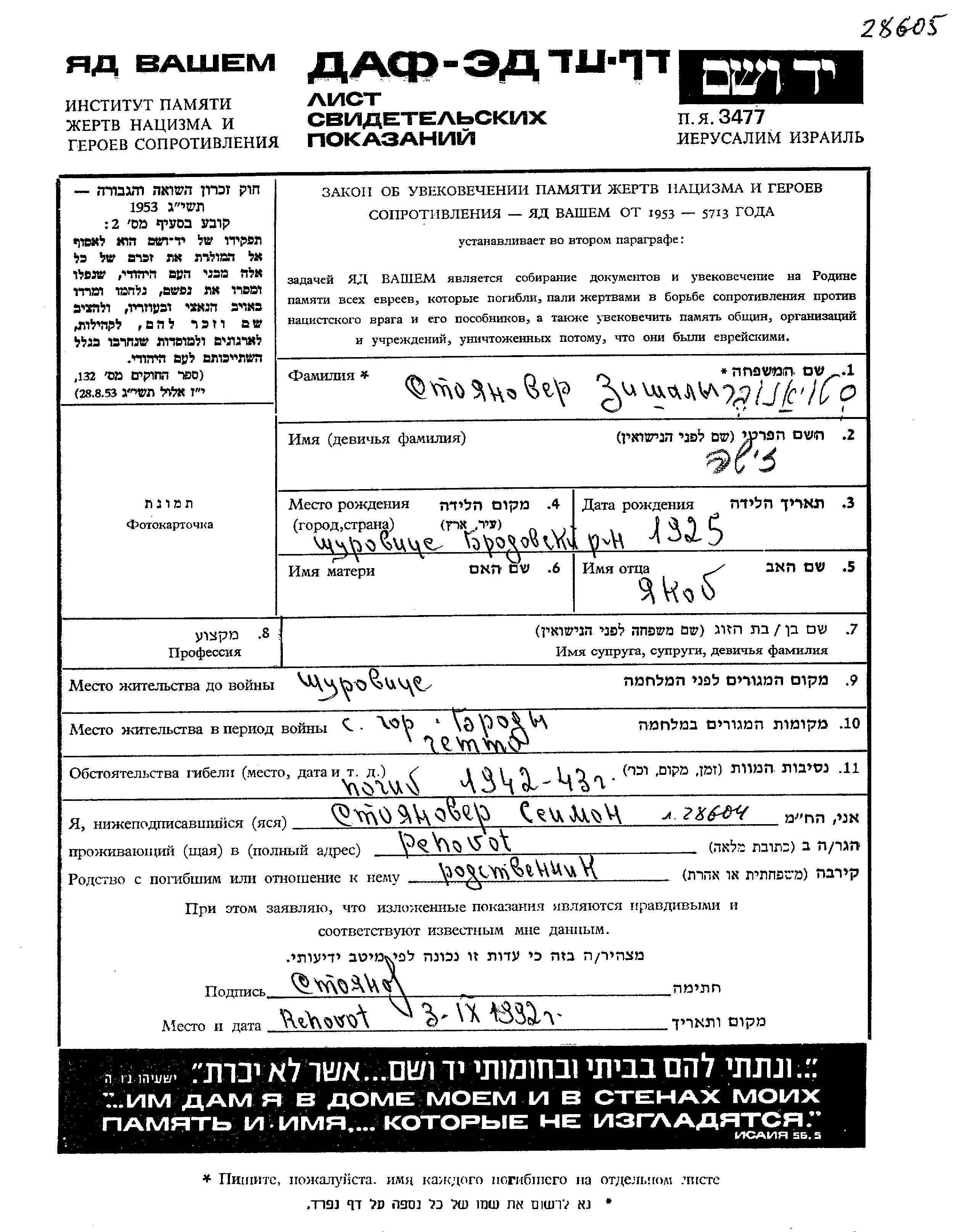 Зиша Стояновер, место рождения: Щуровичи, Польша. Отец: Якоб. Место жительства до войны: Щуровичи, Польша. Место во время войны: Броды, Польша.
