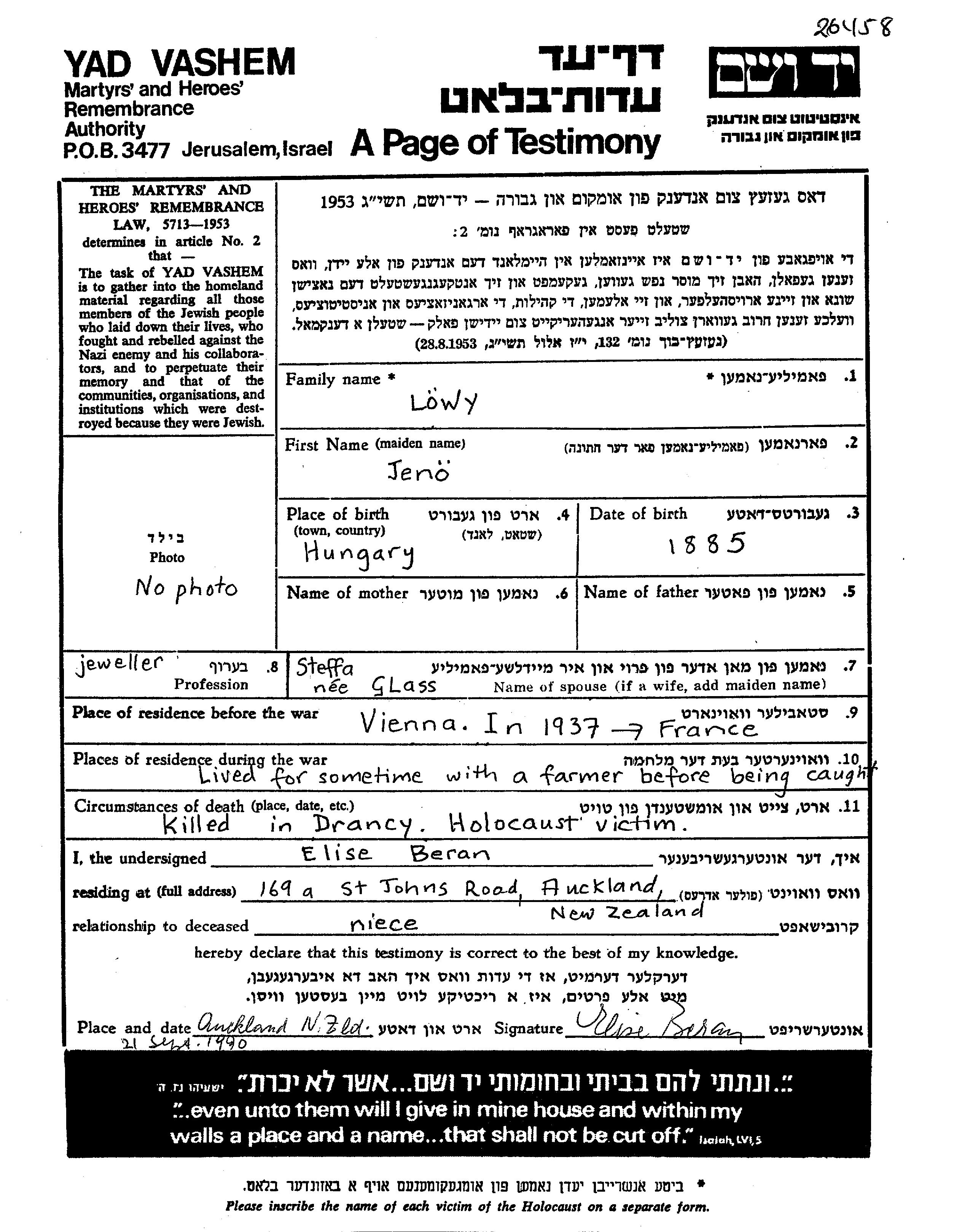 Ено Лёви, место рождения: Венгрия. Ювелир. Женат / замужем. Место жительства до войны: Вена, Австрия. Место во время войны: Франция.