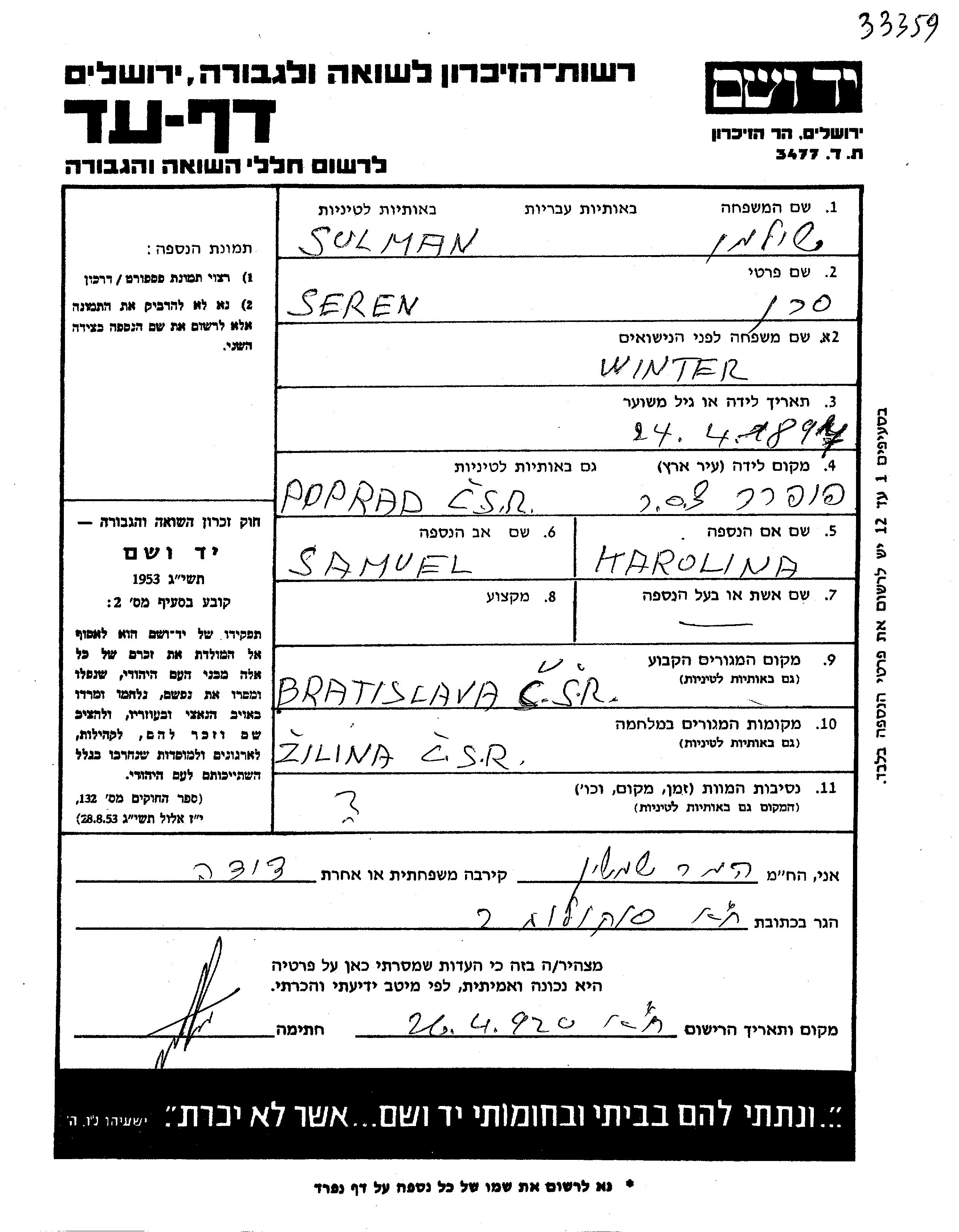 Серен Сульман, девичья фамилия Винтер, место рождения: Попрад, Чехословакия. Отец: Самуэль, mать:Каролина. Женат / замужем. Место жительства до войны: Братислава, Чехословакия. Место во время войны: Жилина, Чехословакия.