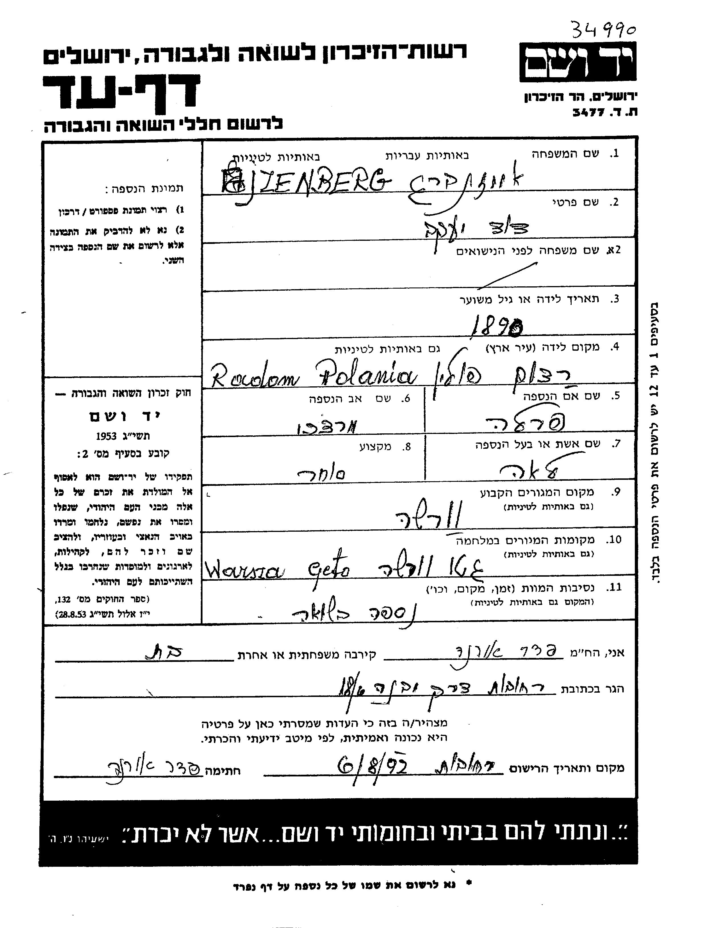 Якоб Давид Айзенберг, место рождения: Радом, Польша. Отец: Мордехай, mать:Перла. Торговец / торговка. Женат / замужем. Место жительства до войны: Варшава, Польша. Место во время войны: Варшава, Польша.