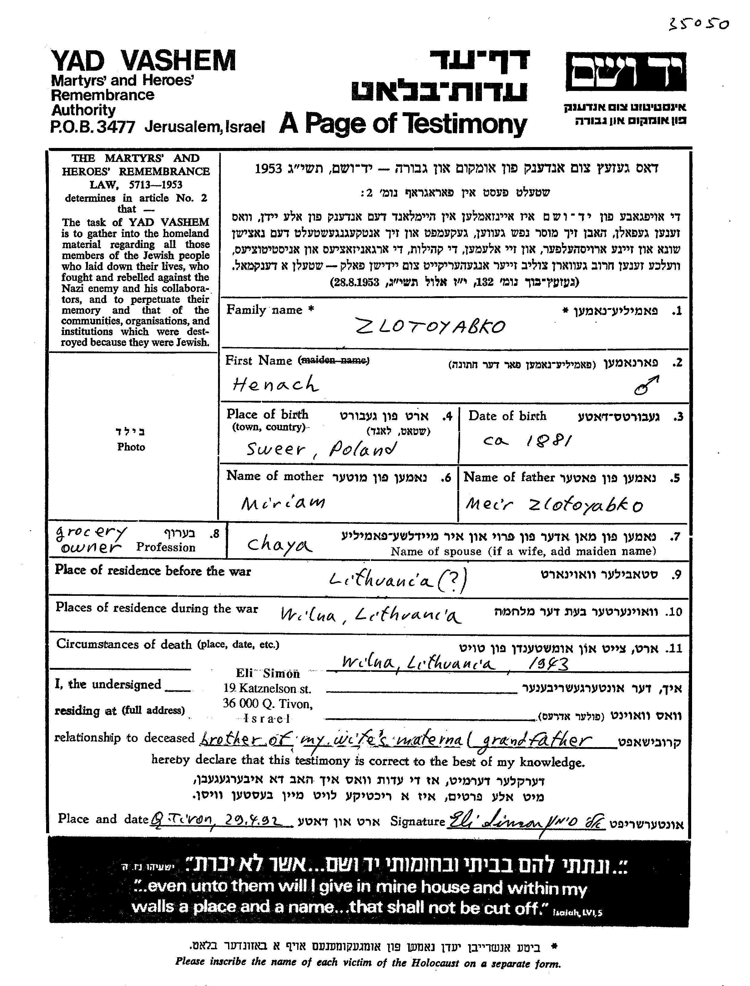 Хенах Злотоябко, место рождения: Свирь, Польша. Отец: Меир, mать:Мирьям. Владелец / владелица магазина. Женат / замужем. Место жительства до войны: Польша. Место во время войны: Вильно, Польша.