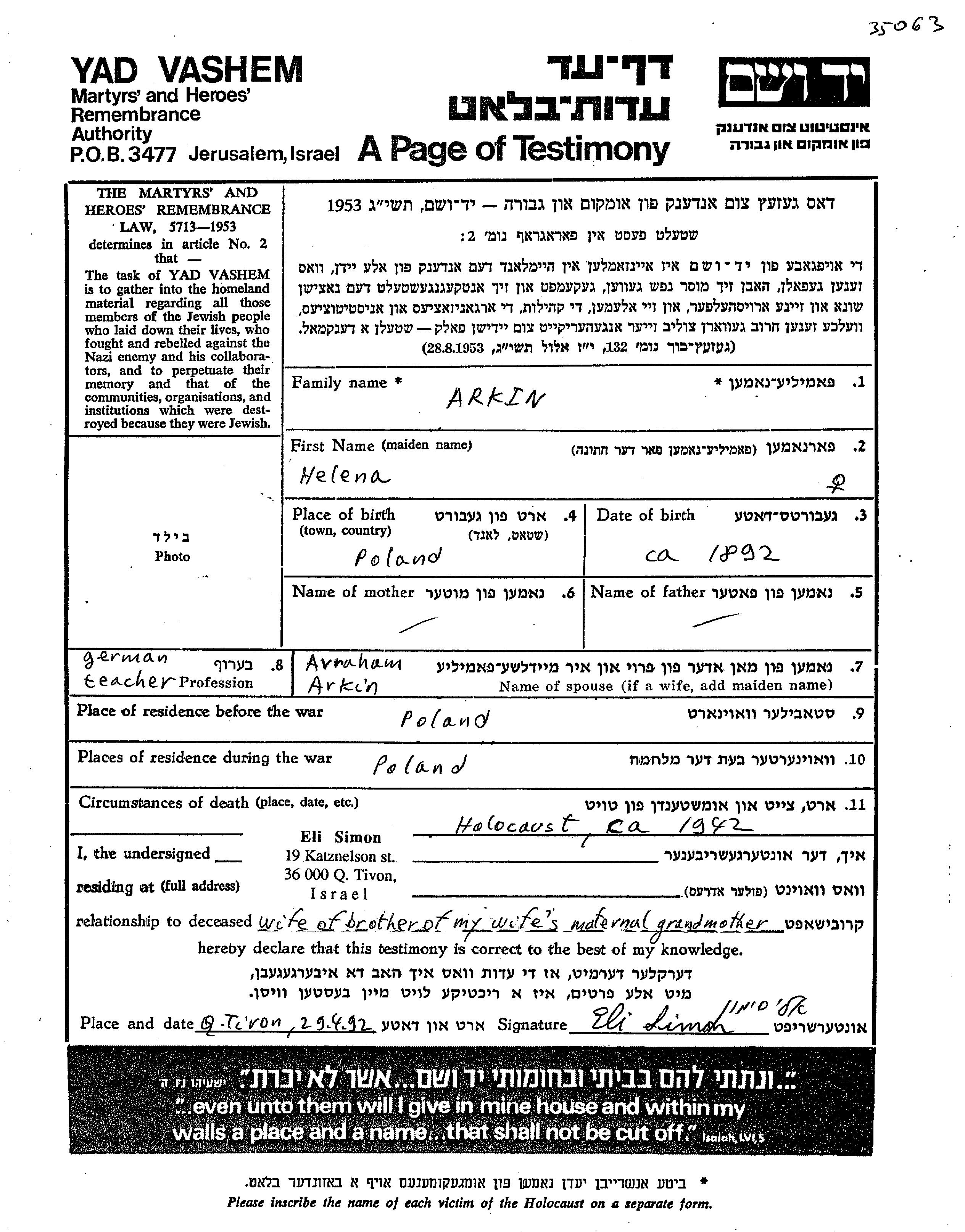Хелена Аркин, место рождения: Польша. Учитель / учительница. Женат / замужем. Место жительства до войны: Польша. Место во время войны: Польша.
