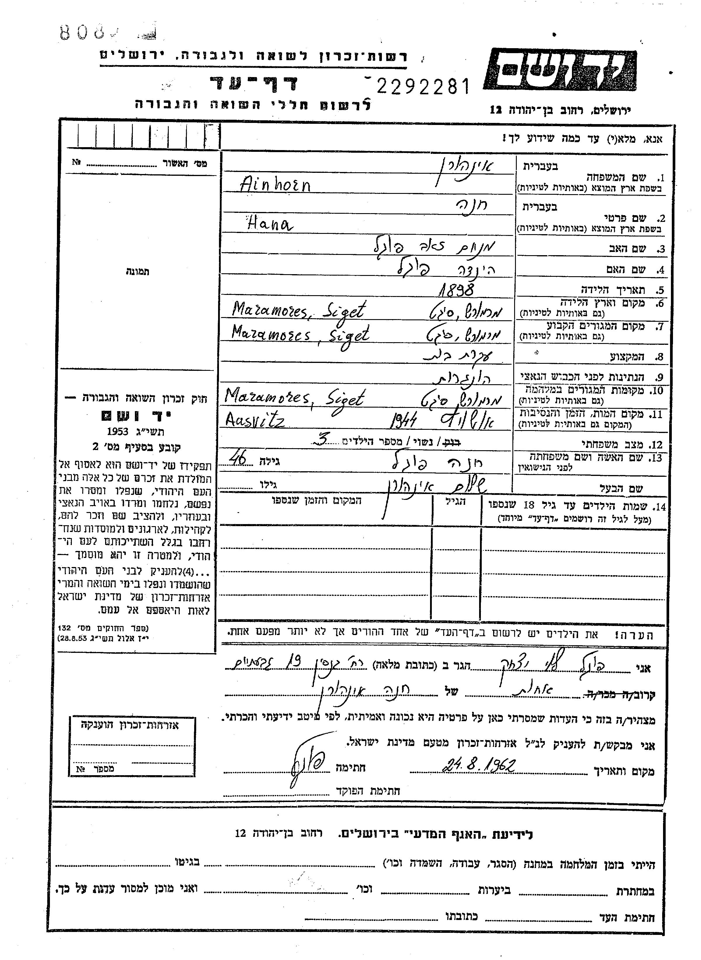 Хана Айнхорн, девичья фамилия Фогель, место рождения: Марамуреш, Румыния. Отец: Менахем Зеев, mать:Хинда. Домохозяйка. Женат / замужем. Место жительства до войны: Марамуреш, Румыния. Место во время войны: Марамуреш, Румыния.