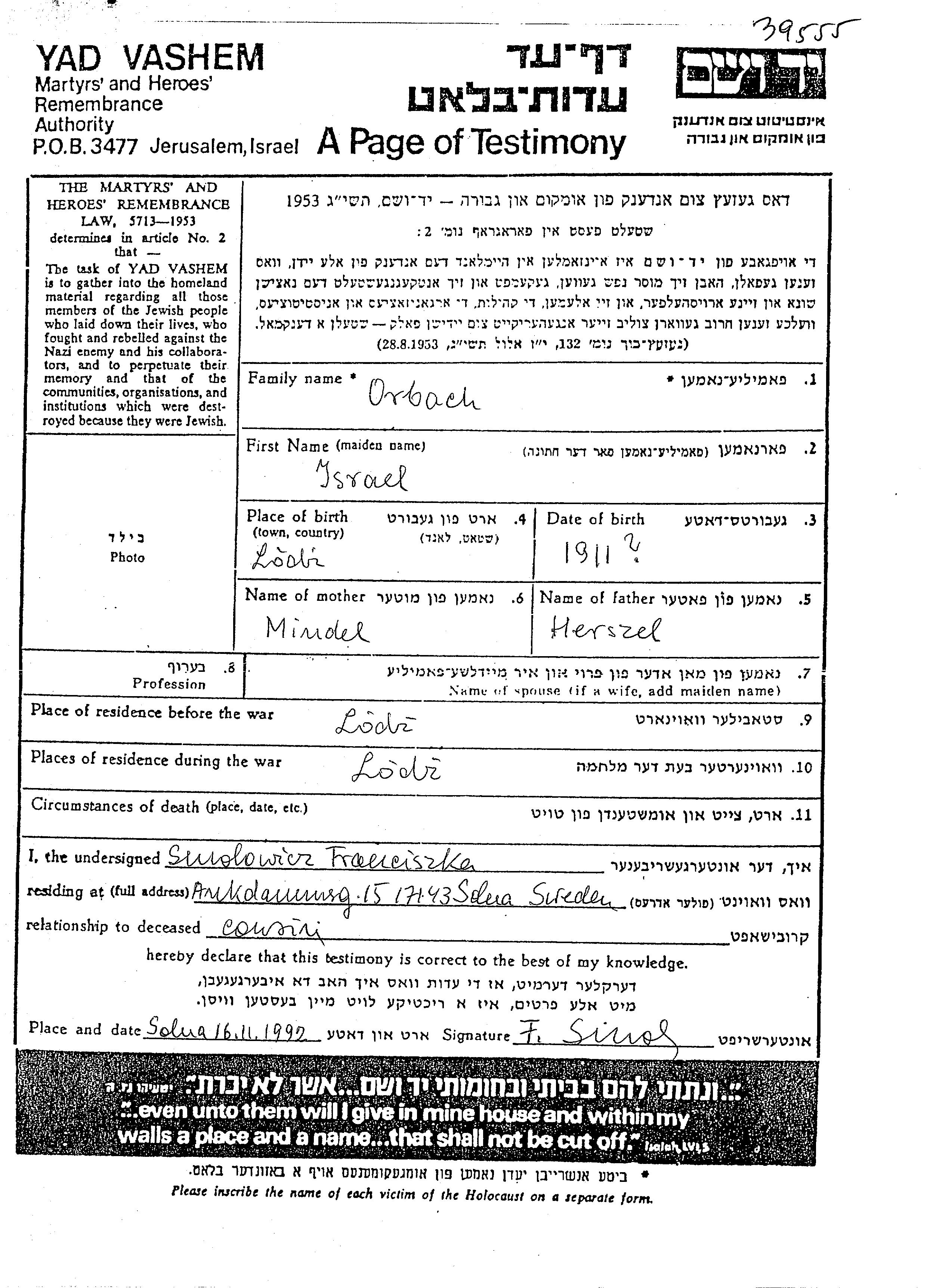 Орбах Исраэль 1911 Лодзь, Польша Лист свидетельских показаний