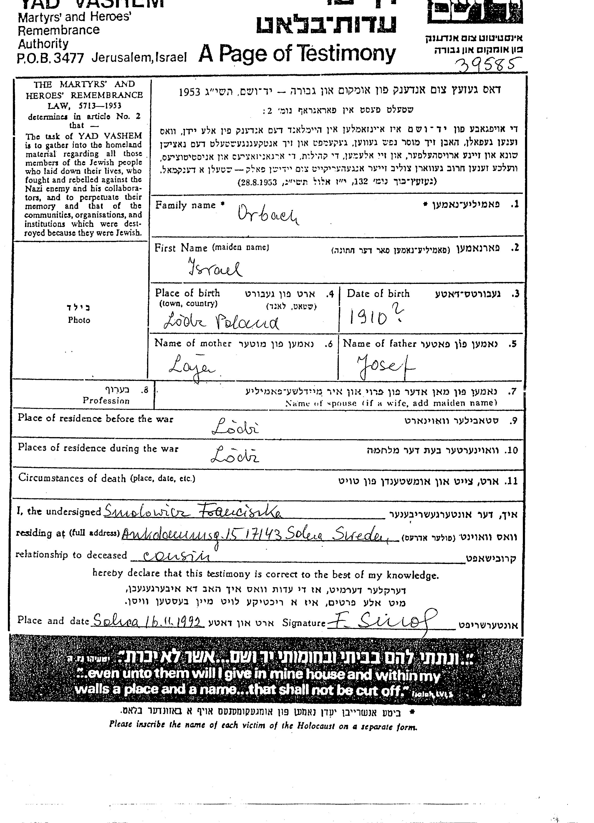Орбах Исраэль 1910 Лодзь, Польша Лист свидетельских показаний