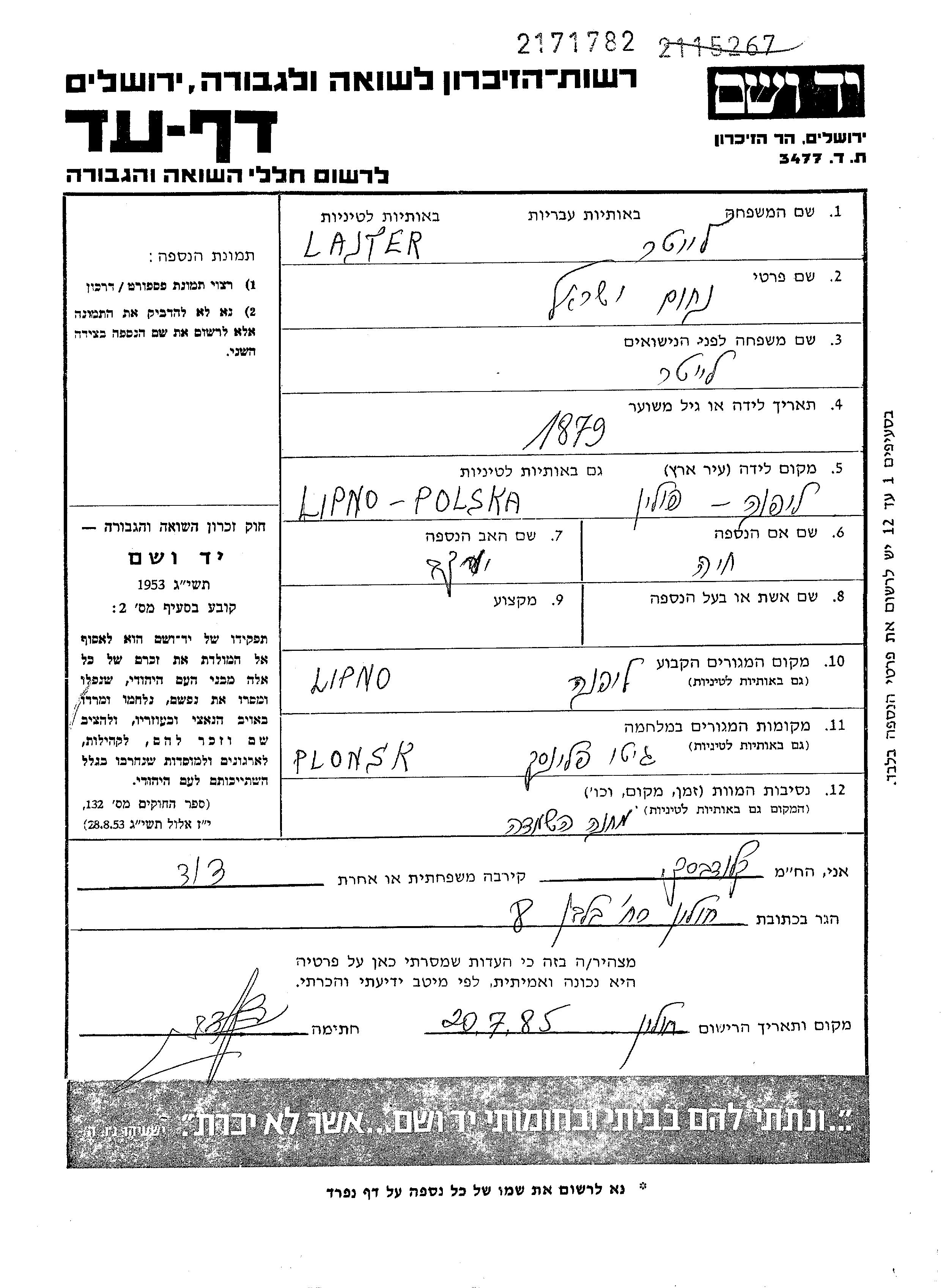 Исраэль Нахум Лайтер, место рождения: Липно, Польша. Отец: Яков, mать:Хая. Женат / замужем. Место жительства до войны: Липно, Польша. Место во время войны: Плоньск, Польша.
