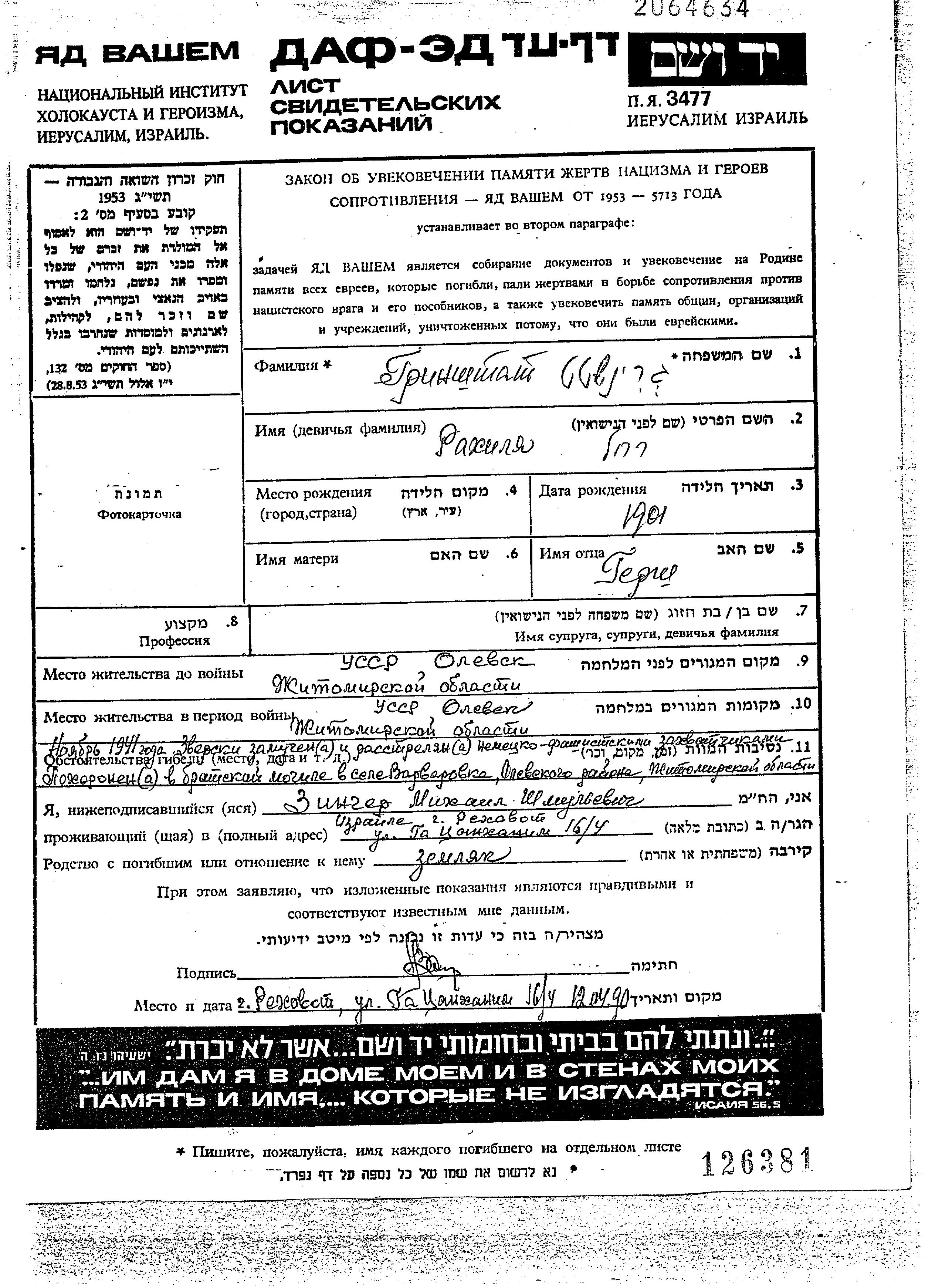 Гринштат Рахиля 1901 Олевск, Украина (СССР) Лист свидетельских показаний