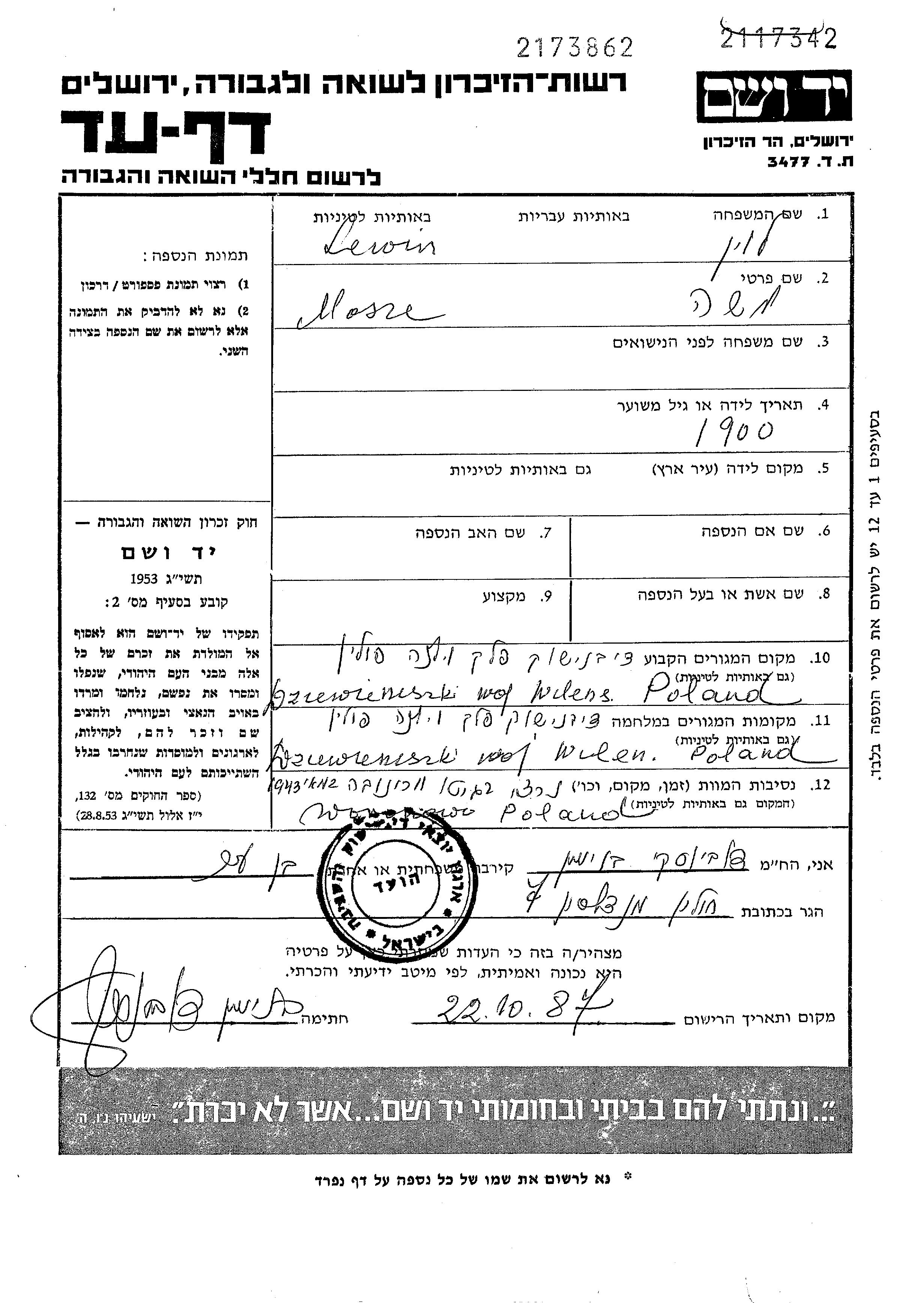 Левин Моше 1900 Девенишки, Польша Лист свидетельских показаний