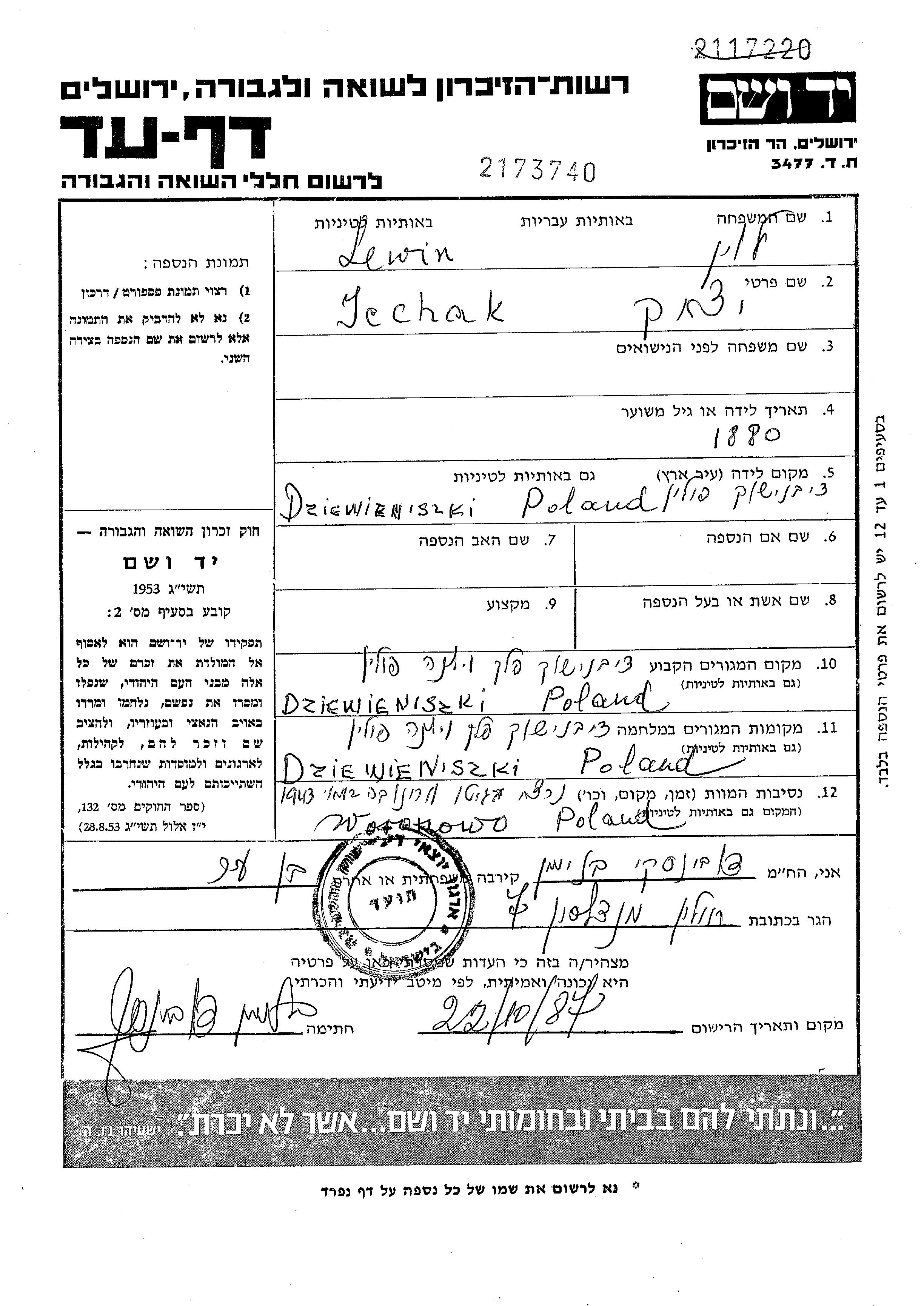 Левин Ицхак 1880 Девенишки, Польша Лист свидетельских показаний