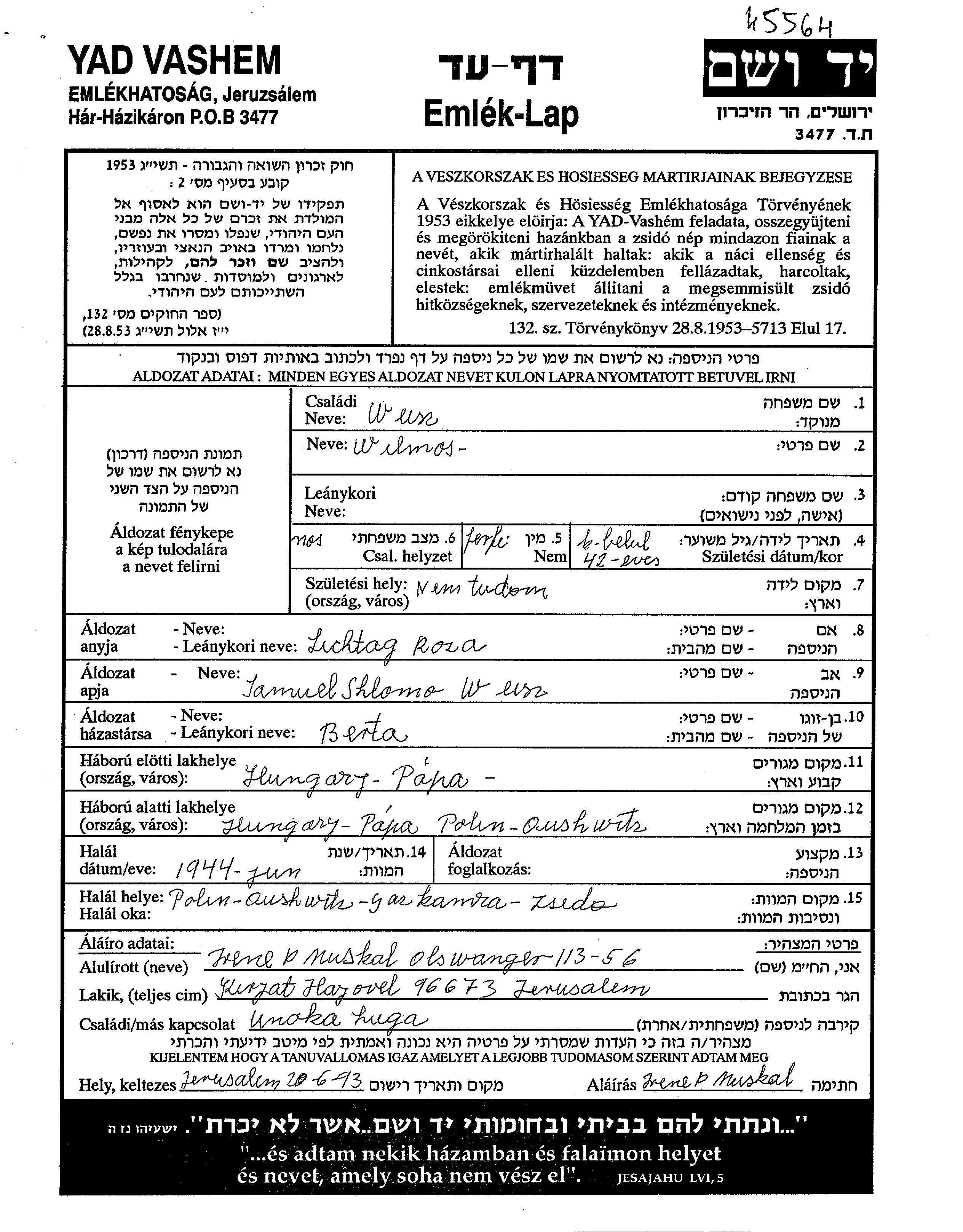 Вильмош Вейс, место рождения: Венгрия. Отец: Шмуэль Шломо, mать:Роза, девичья фамилия Лихтаг. Женат / замужем. Место жительства до войны: Папа, Венгрия. Место во время войны: Папа, Венгрия.