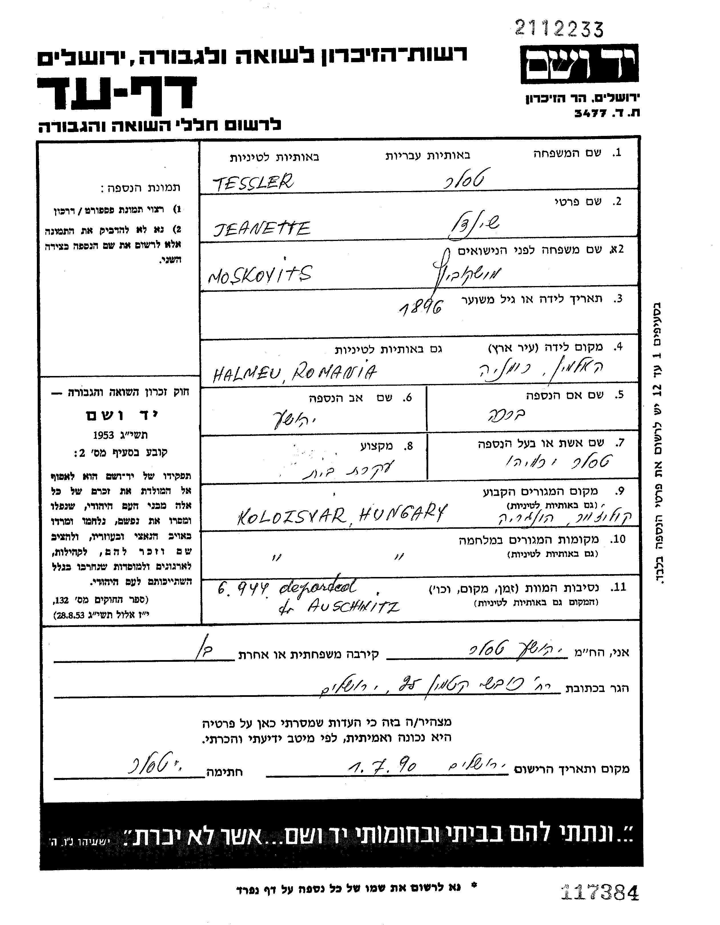 Шейндель Жанетт Тесслер, девичья фамилия Московиц, место рождения: Халмеу, Румыния. Отец: Иегошуа, mать:Браха. Домохозяйка. Женат / замужем. Место жительства до войны: Коложвар, Румыния. Место во время войны: Коложвар, Румыния.