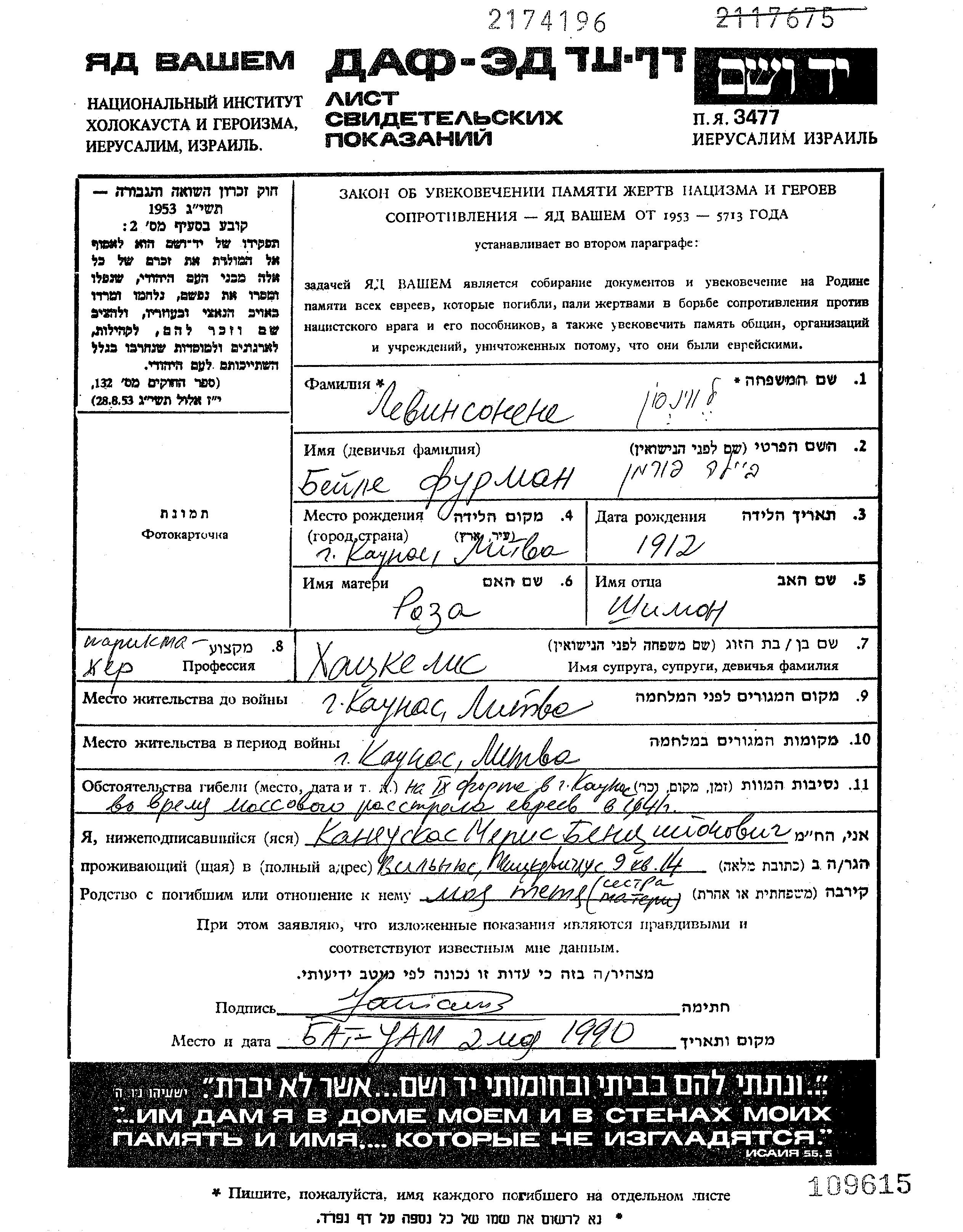 Левинсонене Бейле 1912 Каунас, Литва Лист свидетельских показаний