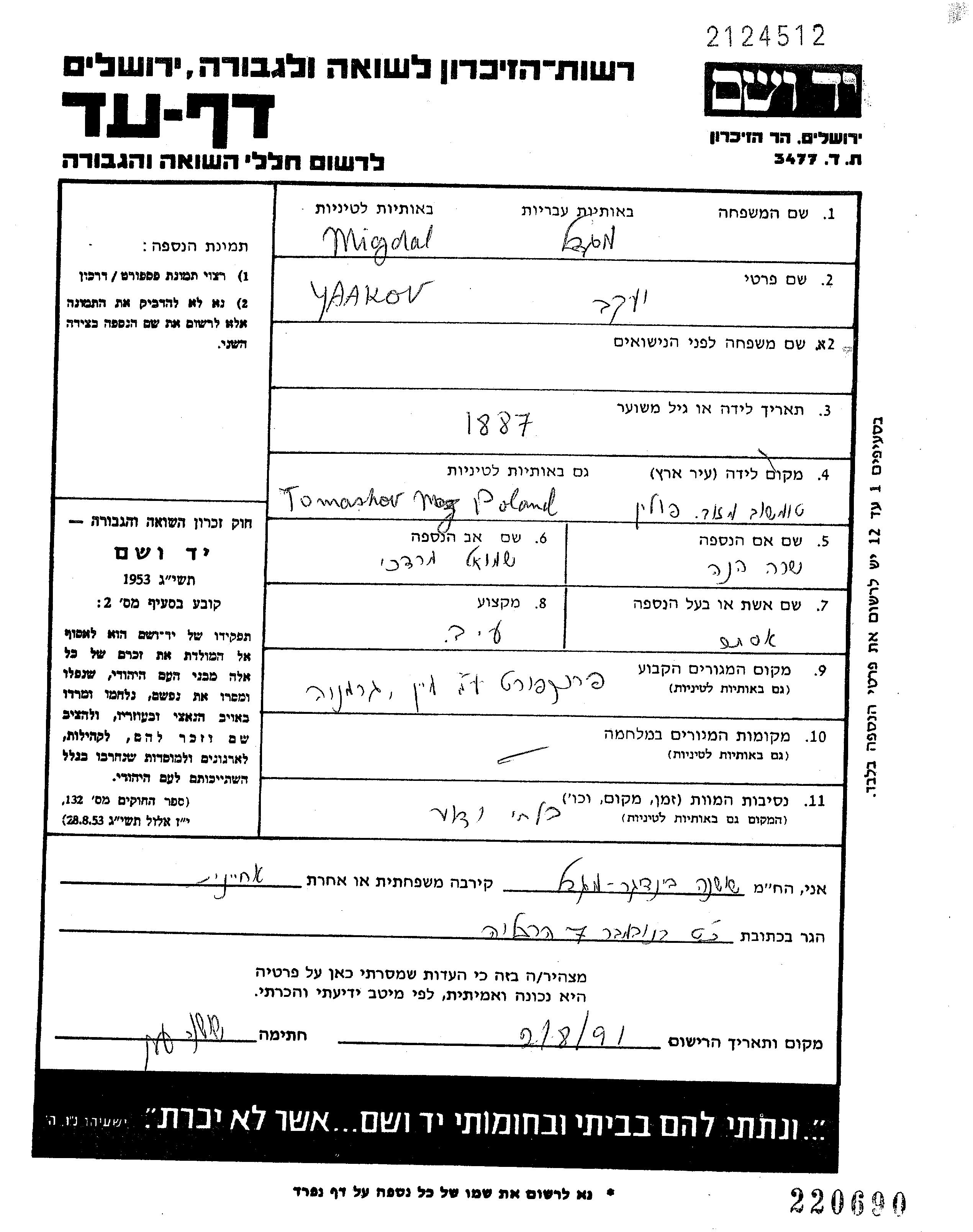 Яков Мигдаль, место рождения: Томашув-Мазовецки, Польша. Отец: Шмуэль Мордехай, mать:Сара Хена. Сапожник. Женат / замужем. Место жительства до войны: Франкфурт-на-Майне, Германия.