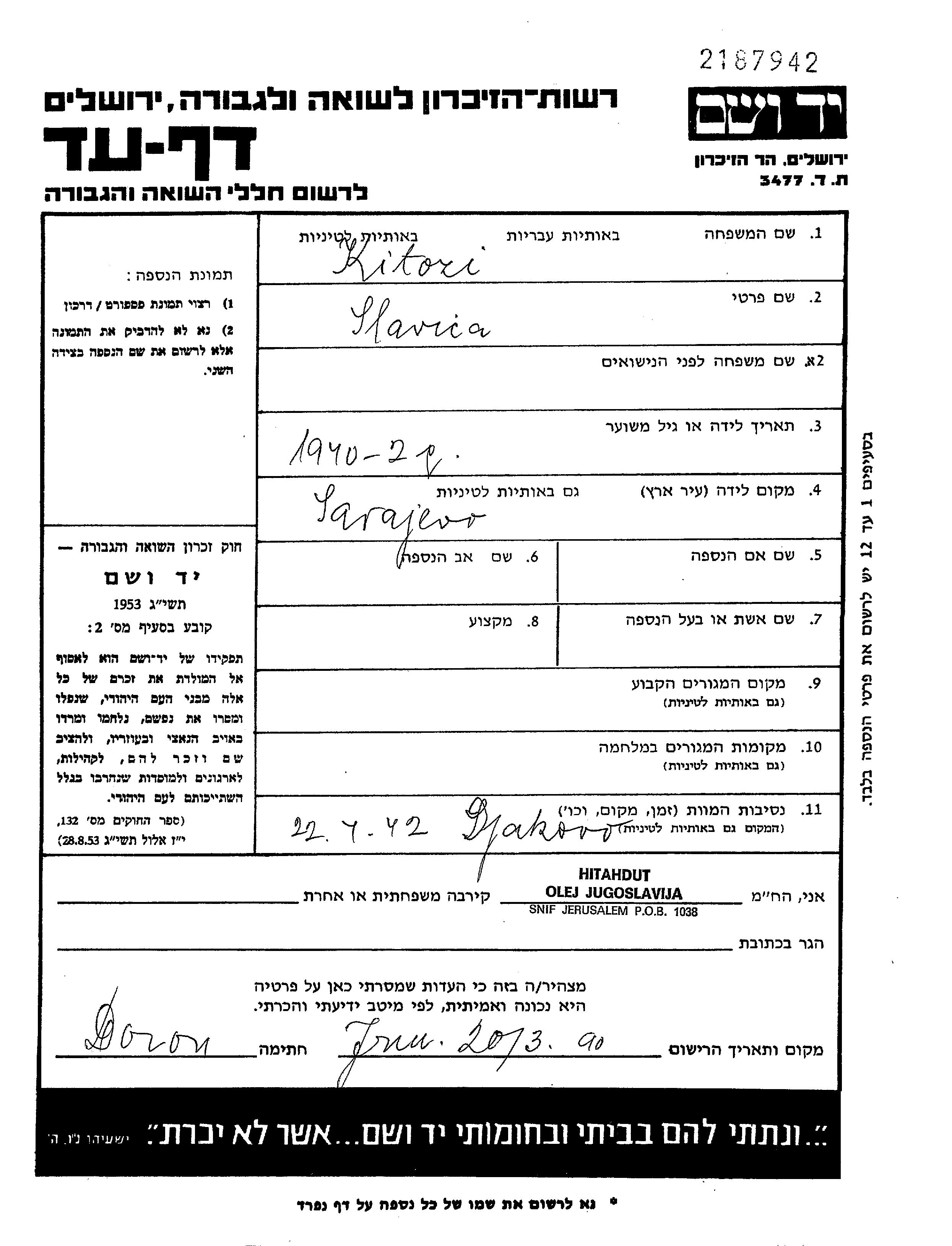 Славица Сильвица уничтоженa в период Шоа. место смерти: Джяково, Югославия в 22/04/1942.