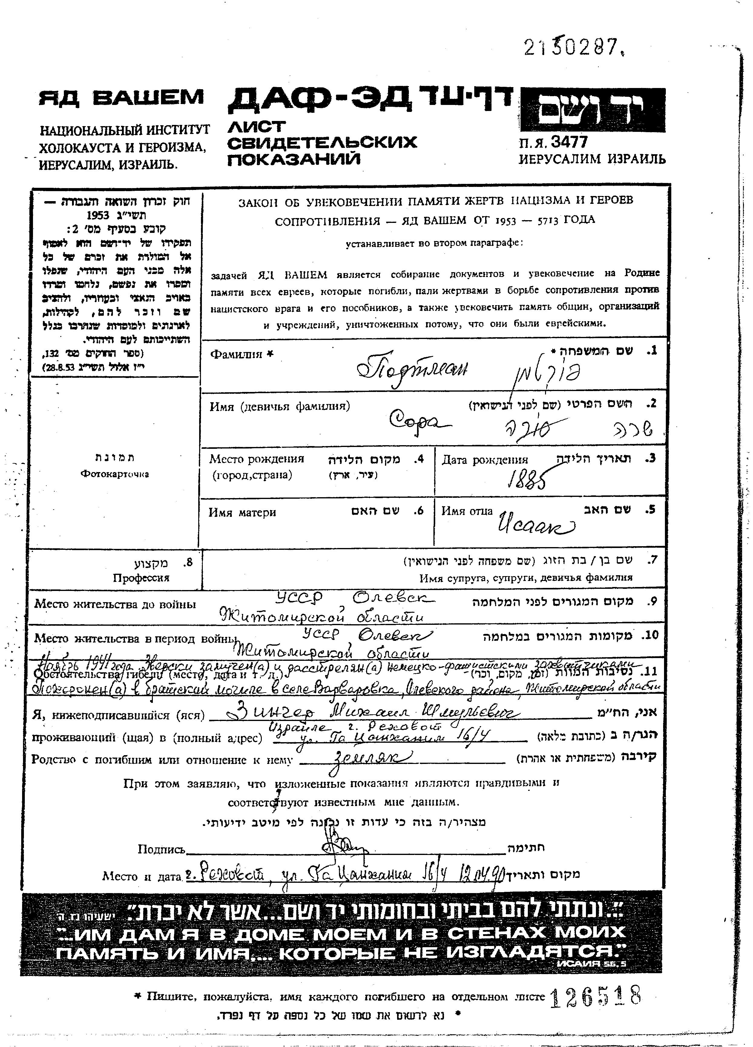 Портман Сора Олевск, Украина (СССР) Лист свидетельских показаний