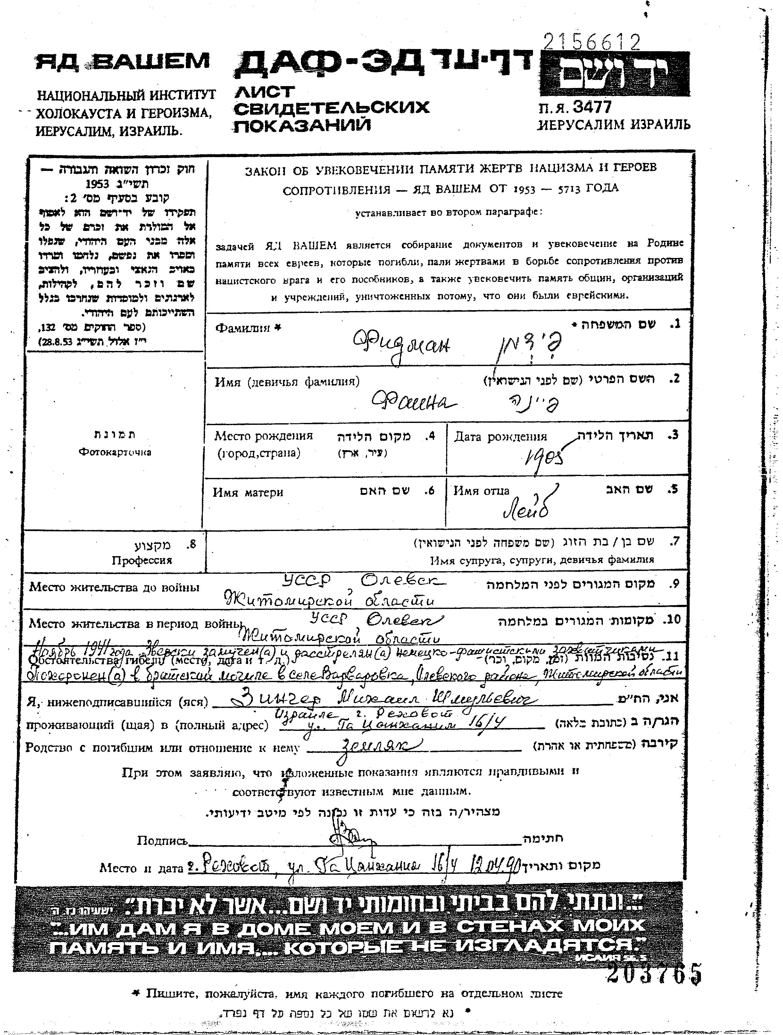 Фидман Фаина 1905 Олевск, Украина (СССР) Лист свидетельских показаний