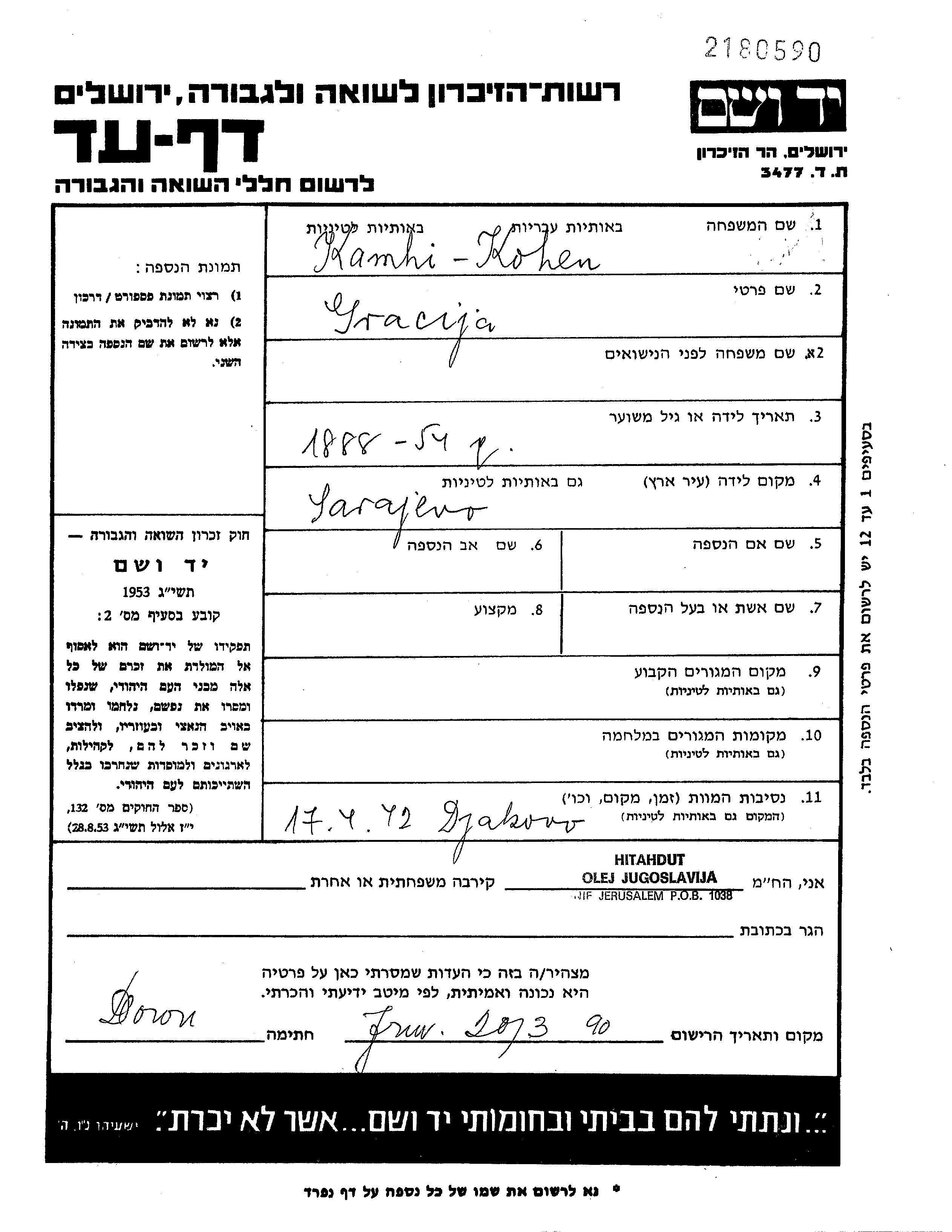 Грация Камхи, девичья фамилия Коэн, место рождения: Сараево, Югославия. Женат / замужем. Место жительства до войны: Югославия. Место во время войны: Югославия.