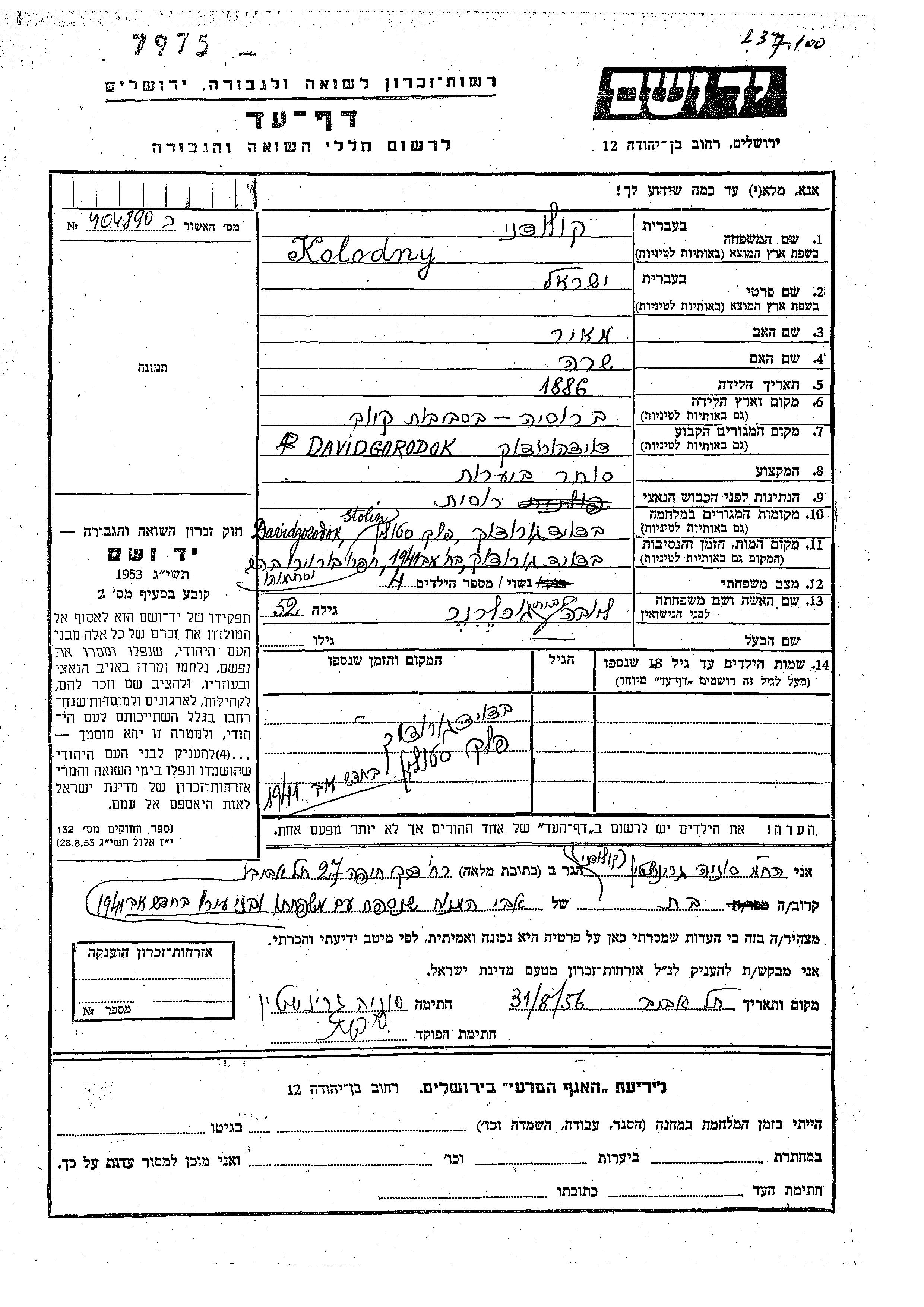 Исраэль Колодный, место рождения: Россия (СССР). Отец: Меир, mать:Сара. Торговец / торговка. Женат / замужем. Место жительства до войны: Давид-Городок, Польша. Место во время войны: Давид-Городок, Польша.