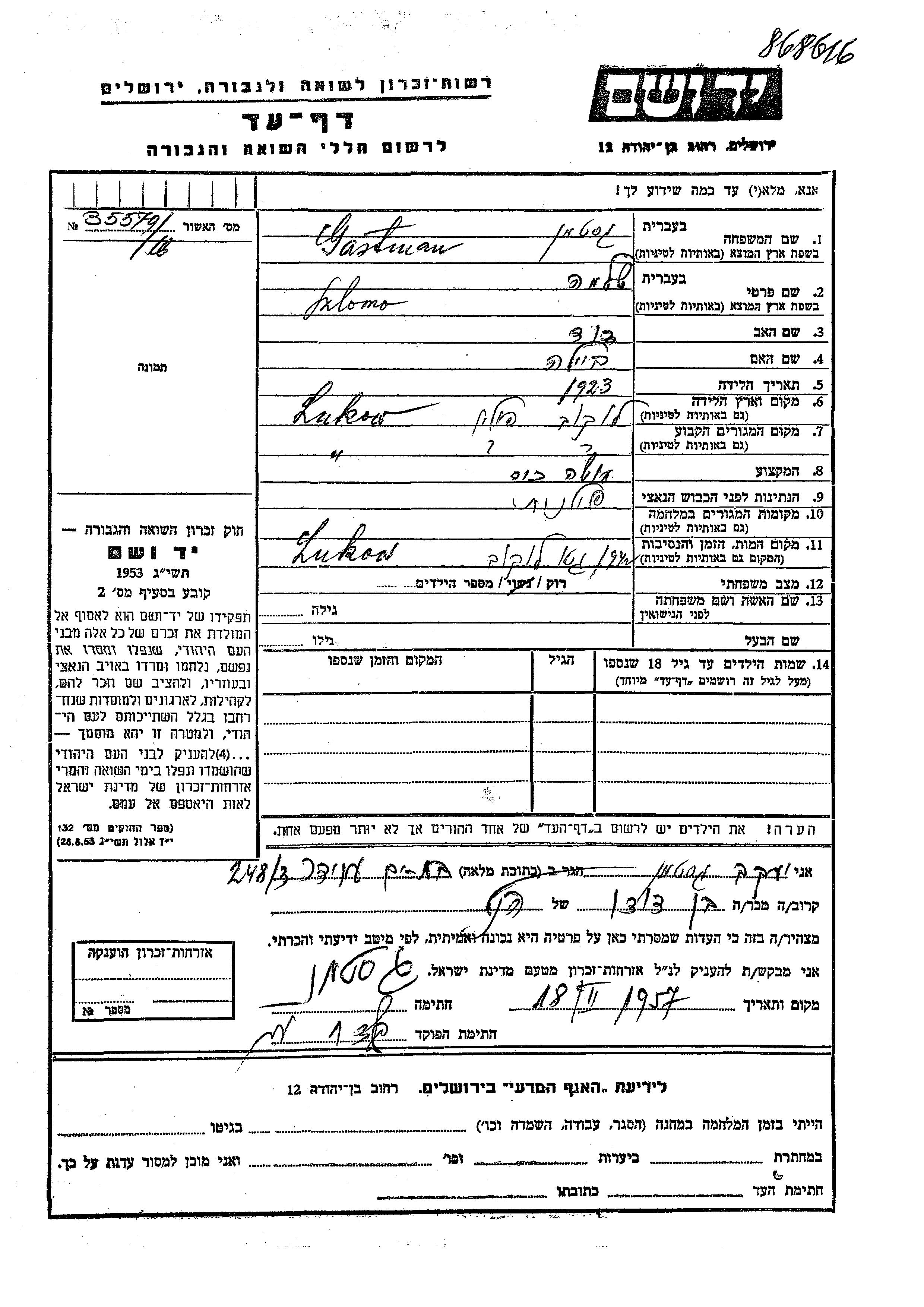 Шломо Гастман, место рождения: Лукув, Польша. Отец: Давид, mать:Бейла. מייצר כוסות. Холост / не замужем. Место жительства до войны: Лукув, Польша.