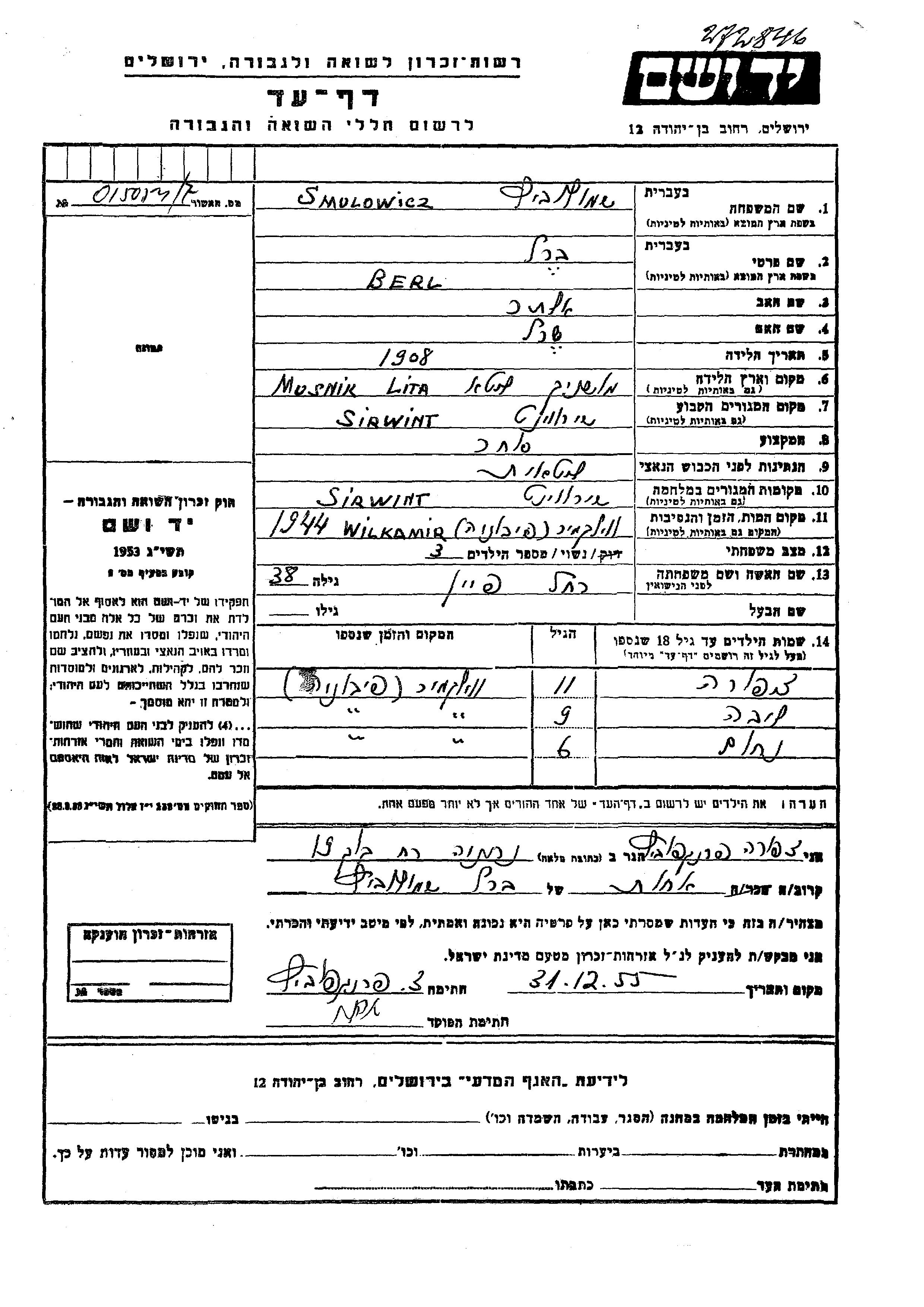 Берл Смулович, место рождения: Мусник, Литва. Отец: Алтер, mать:Шарль. Торговец / торговка. Женат / замужем. Место жительства до войны: Ширвинты, Литва. Место во время войны: Ширвинты, Литва.