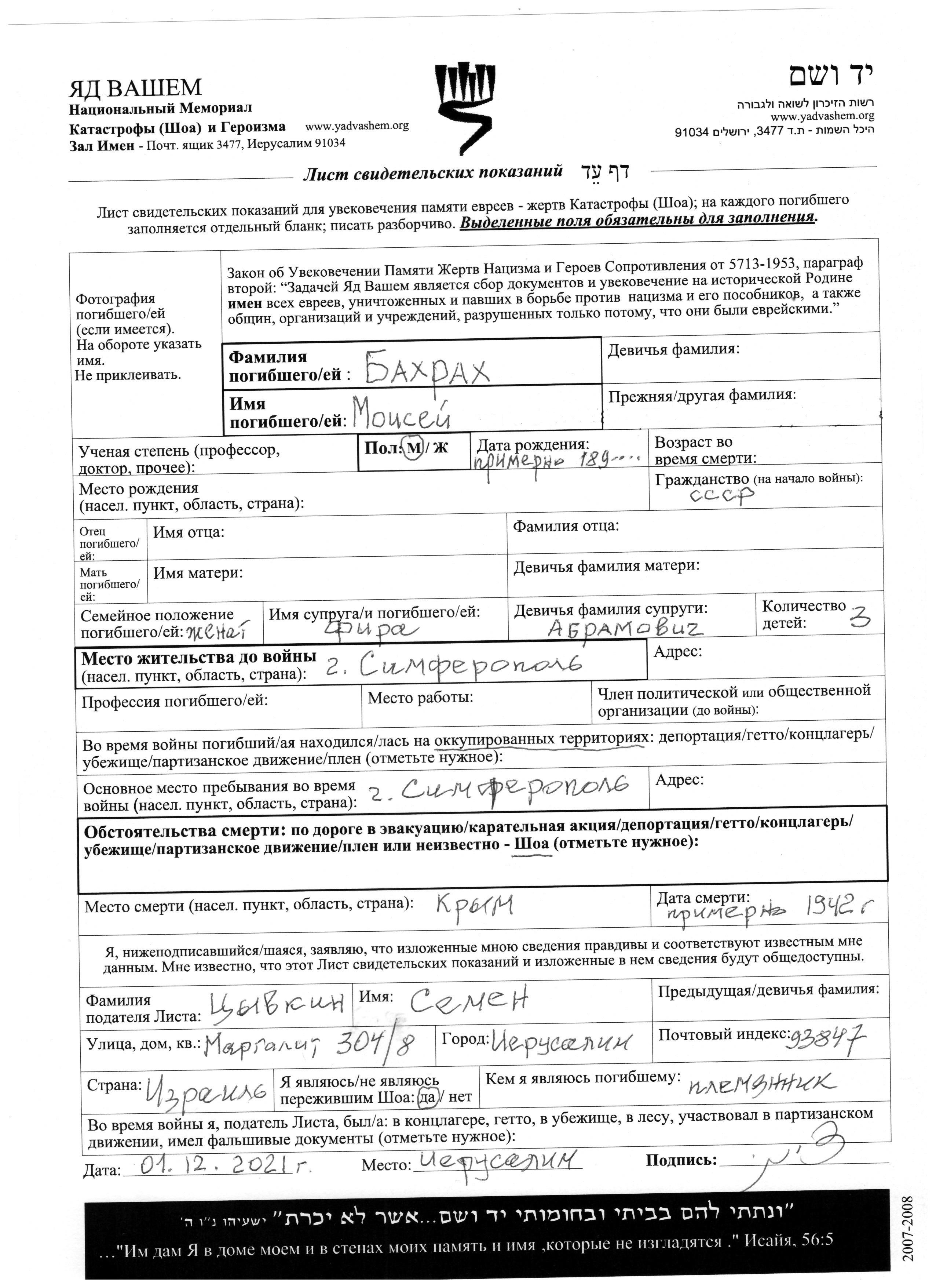 Бахрах Моисей 1890 Симферополь, Россия (СССР) Лист свидетельских показаний