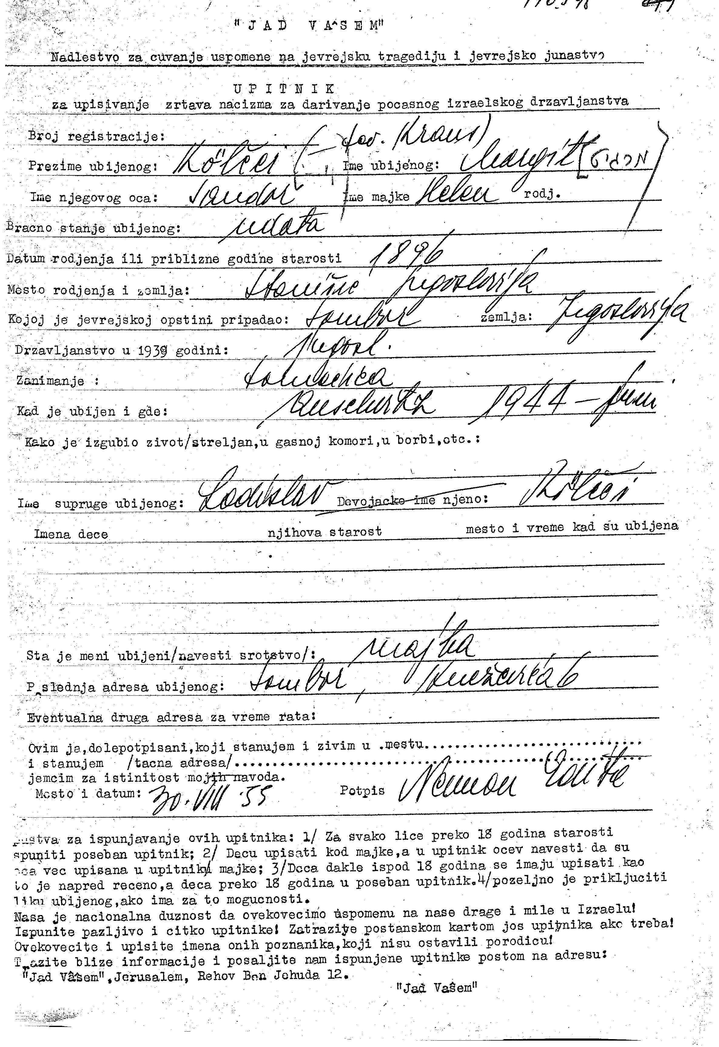 Маргит Кёльцер, девичья фамилия Краус, место рождения: Станишич, Югославия. Отец: Сандор, mать:Хелен. Домохозяйка. Женат / замужем. Место жительства до войны: Сомбор, Югославия.