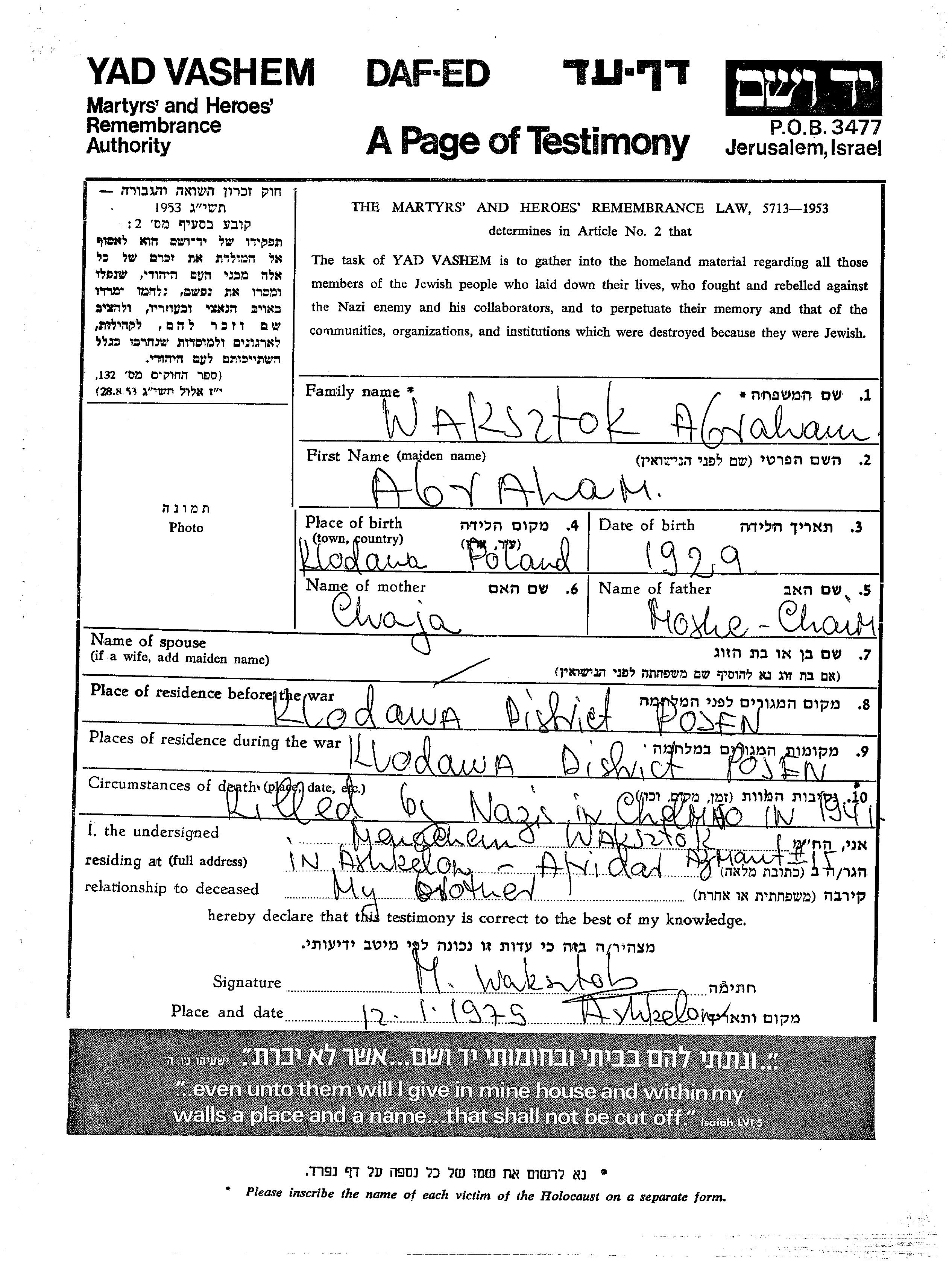 Вакшток Абраам 1929 Клодава, Польша Лист свидетельских показаний