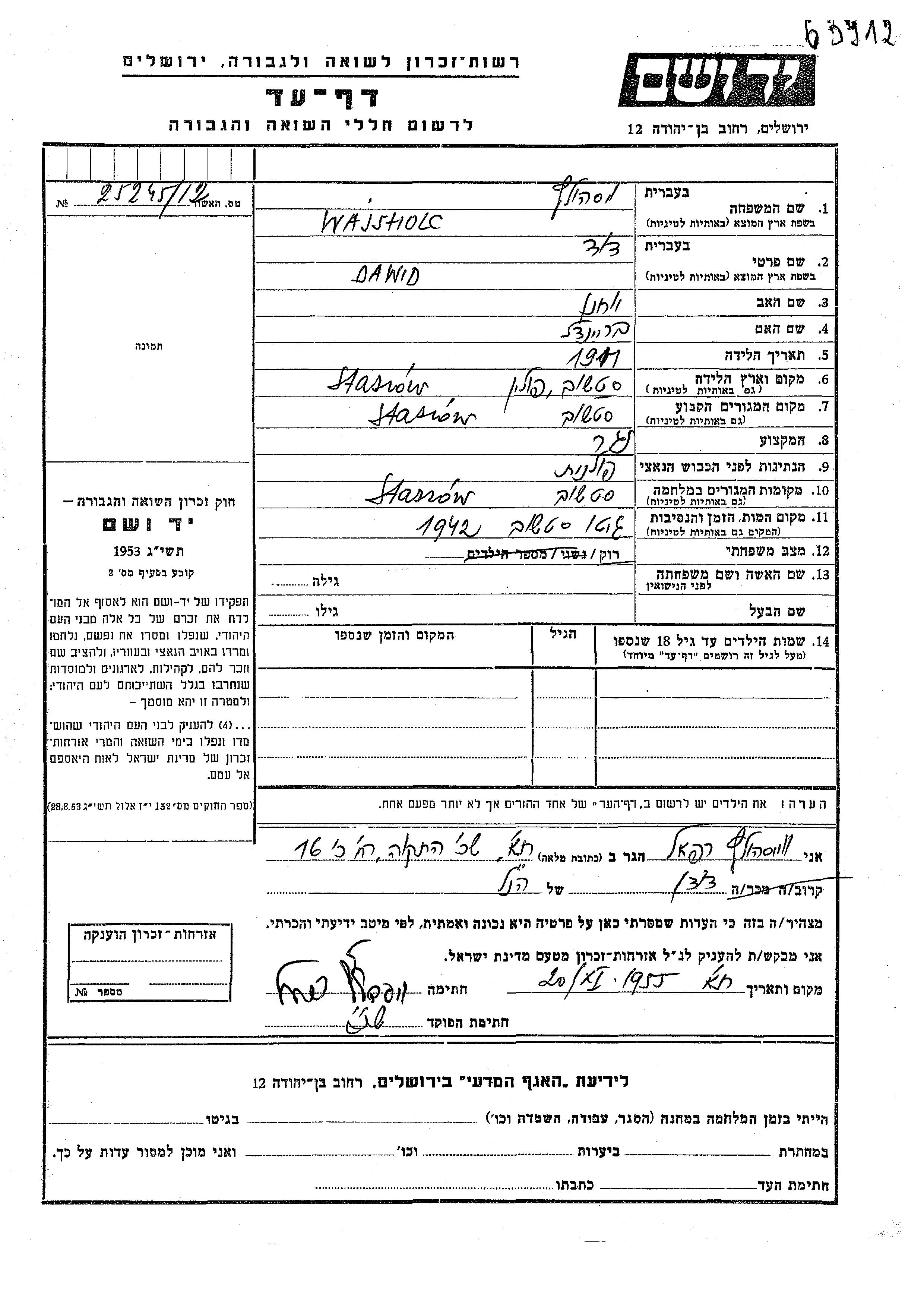 Давид Вайсхольц, место рождения: Сташув, Польша. Отец: Иоханан, mать:Брейндл. Столяр / плотник. Холост / не замужем. Место жительства до войны: Сташув, Польша. Место во время войны: Сташув, Польша.