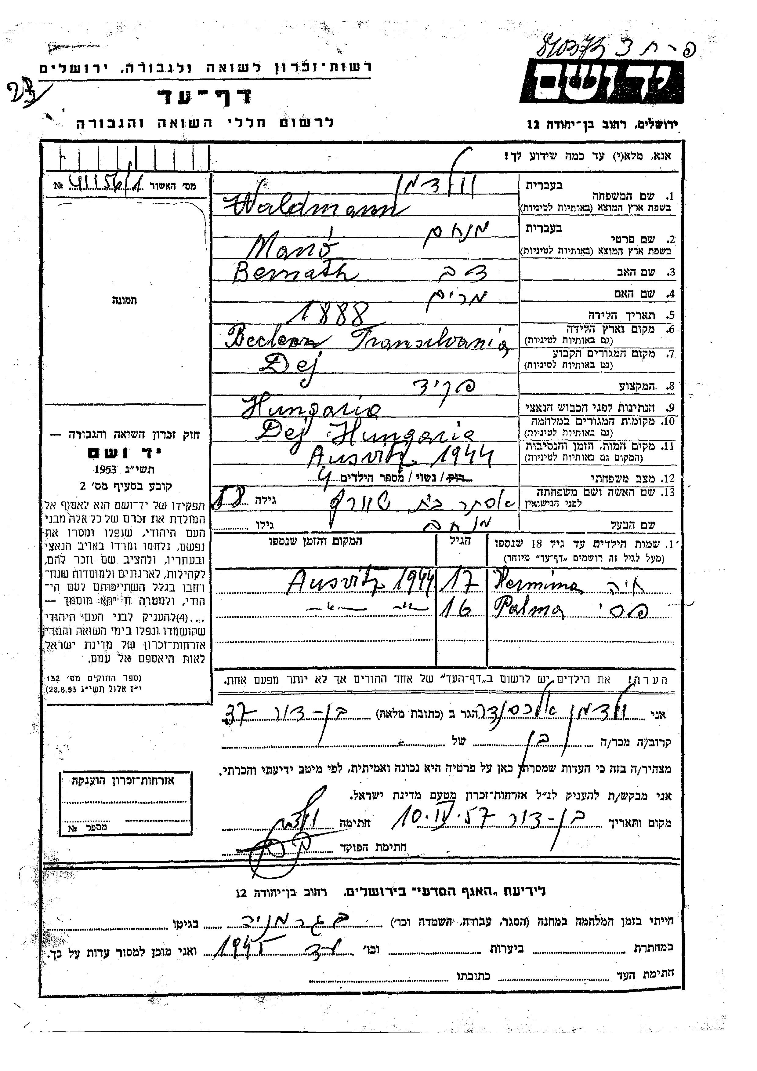 Менахем Вальдманн. Отец: Бернат Дов, mать:Мирьям. Клерк. Женат / замужем. Место жительства до войны: Деж, Румыния. Место во время войны: Венгрия.