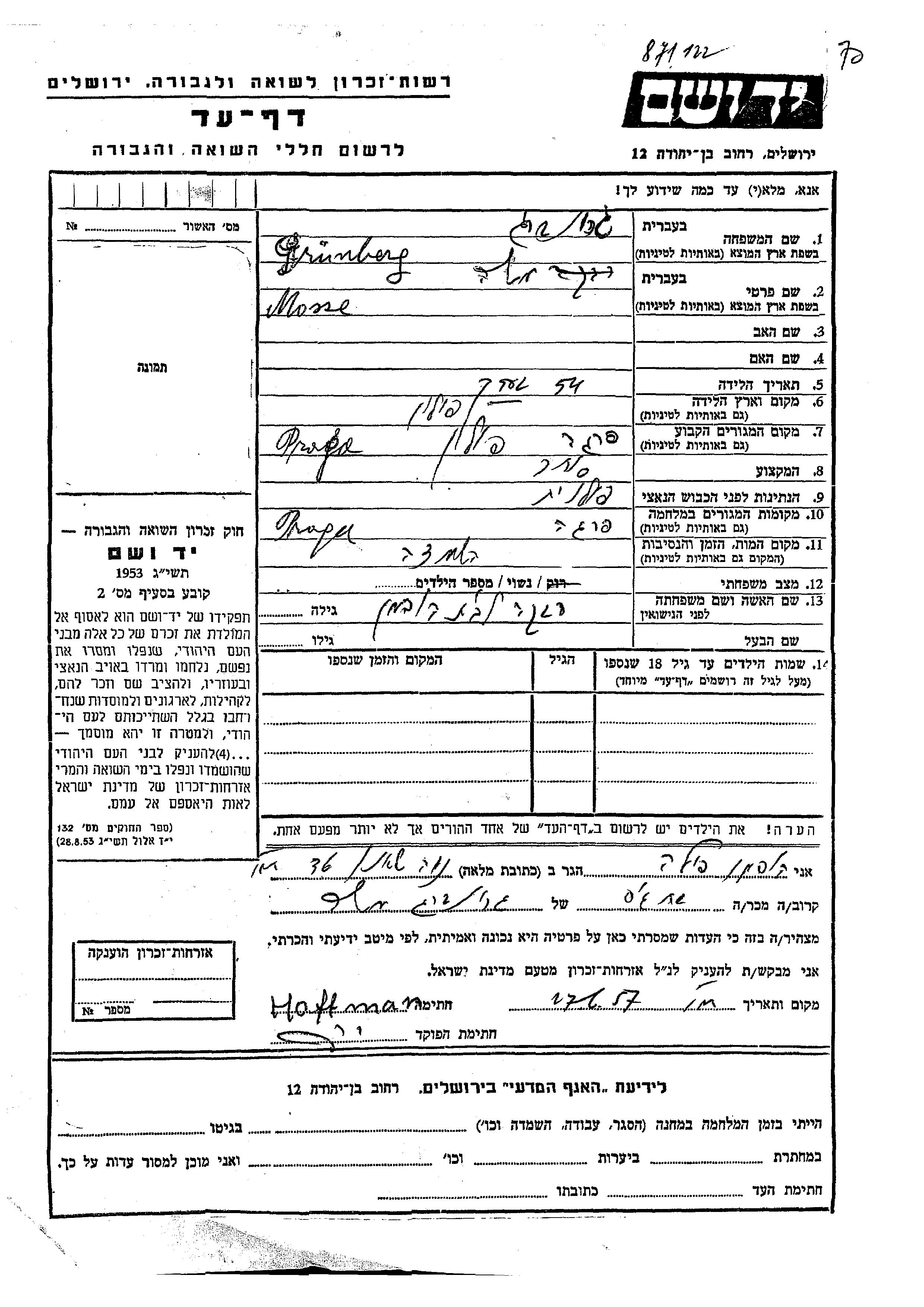 Моше Грюнберг, место рождения: Польша. Торговец / торговка. Женат / замужем. Место жительства до войны: Прага, Польша. Место во время войны: Прага, Польша.