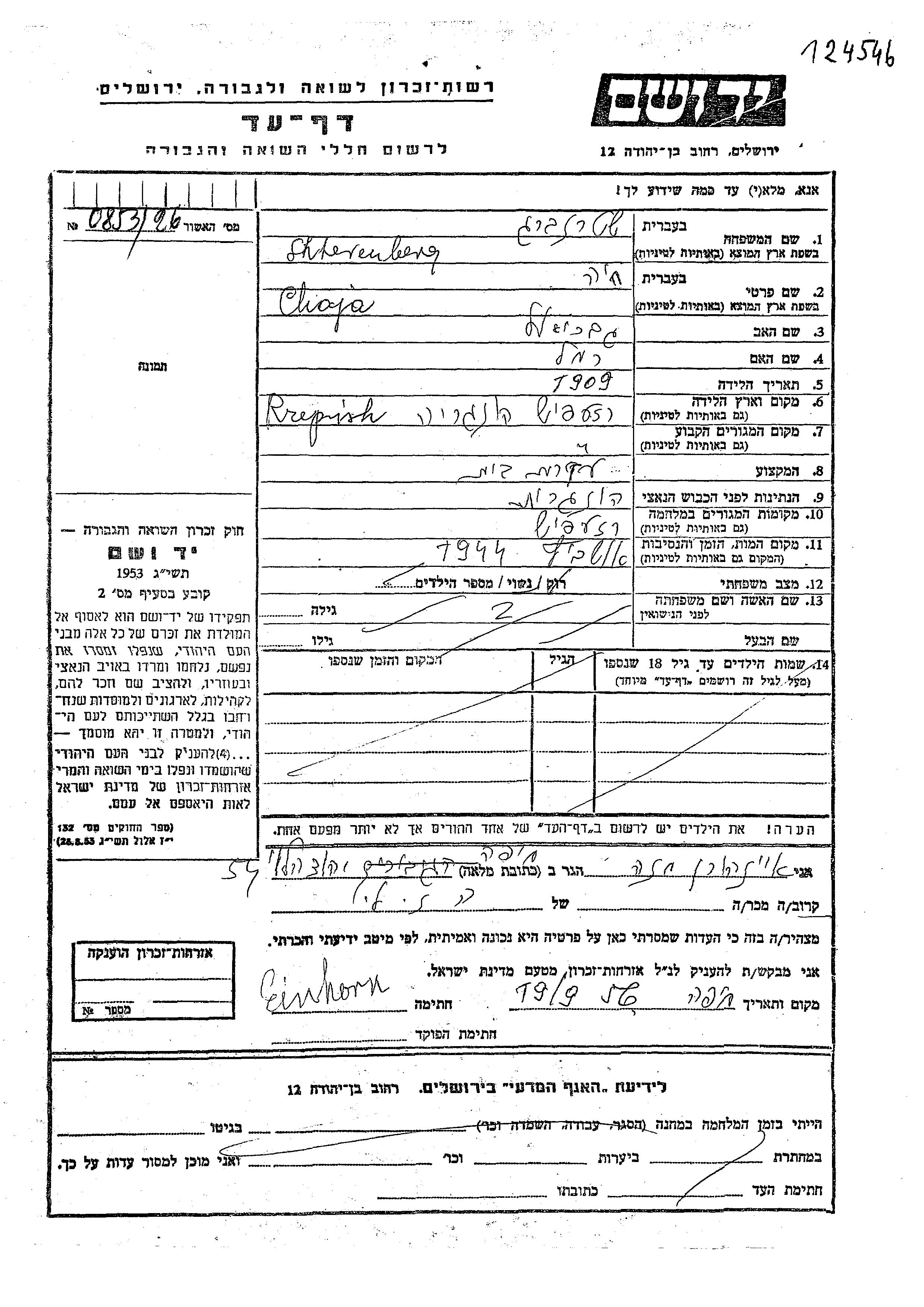 Штеренберг Хая 1909 Rzepisz, Румыния Лист свидетельских показаний