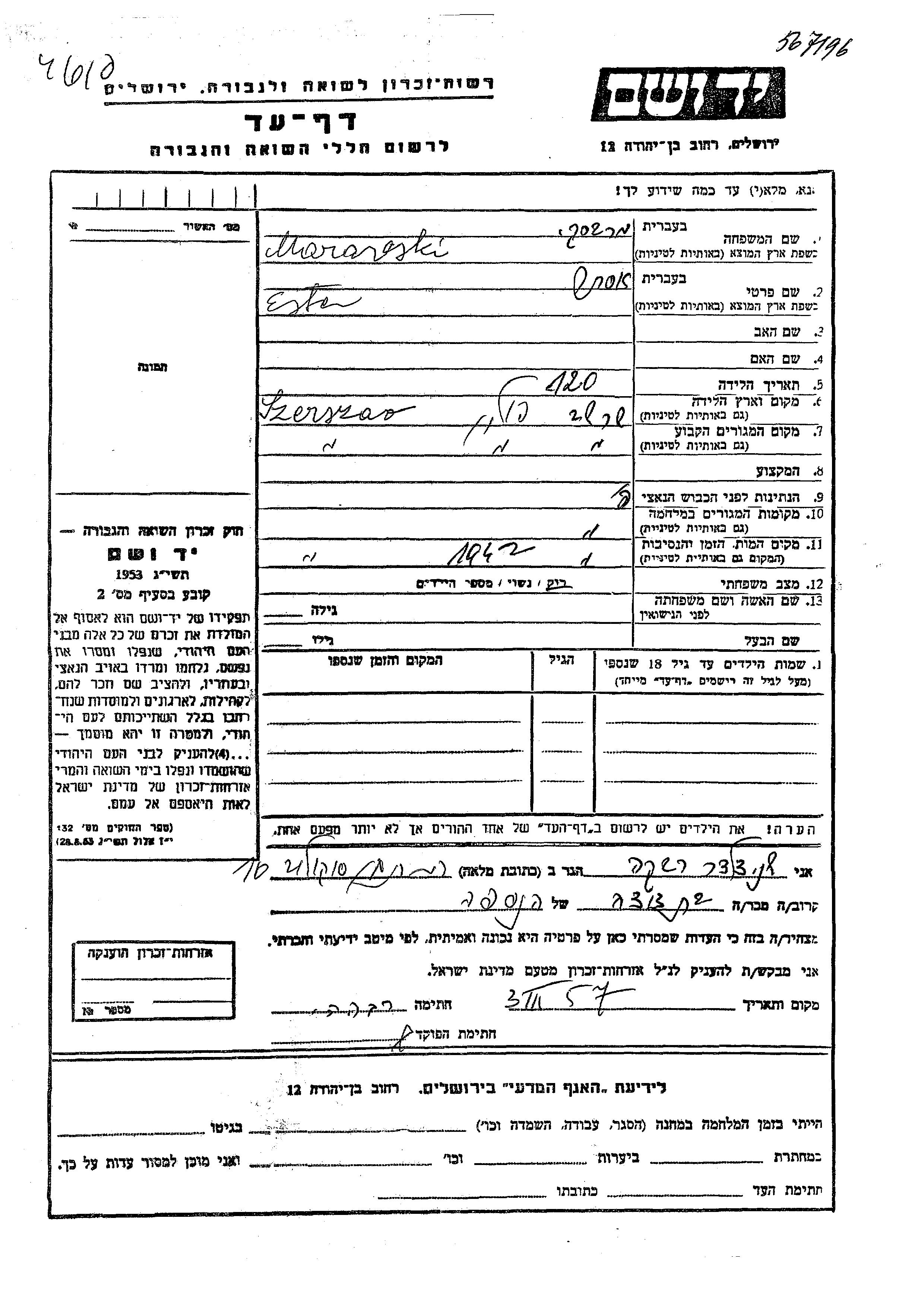 Эстер Маравски, место рождения: Шершев, Польша. Холост / не замужем. Место жительства до войны: Шершев, Польша. Место во время войны: Шершев, Польша.