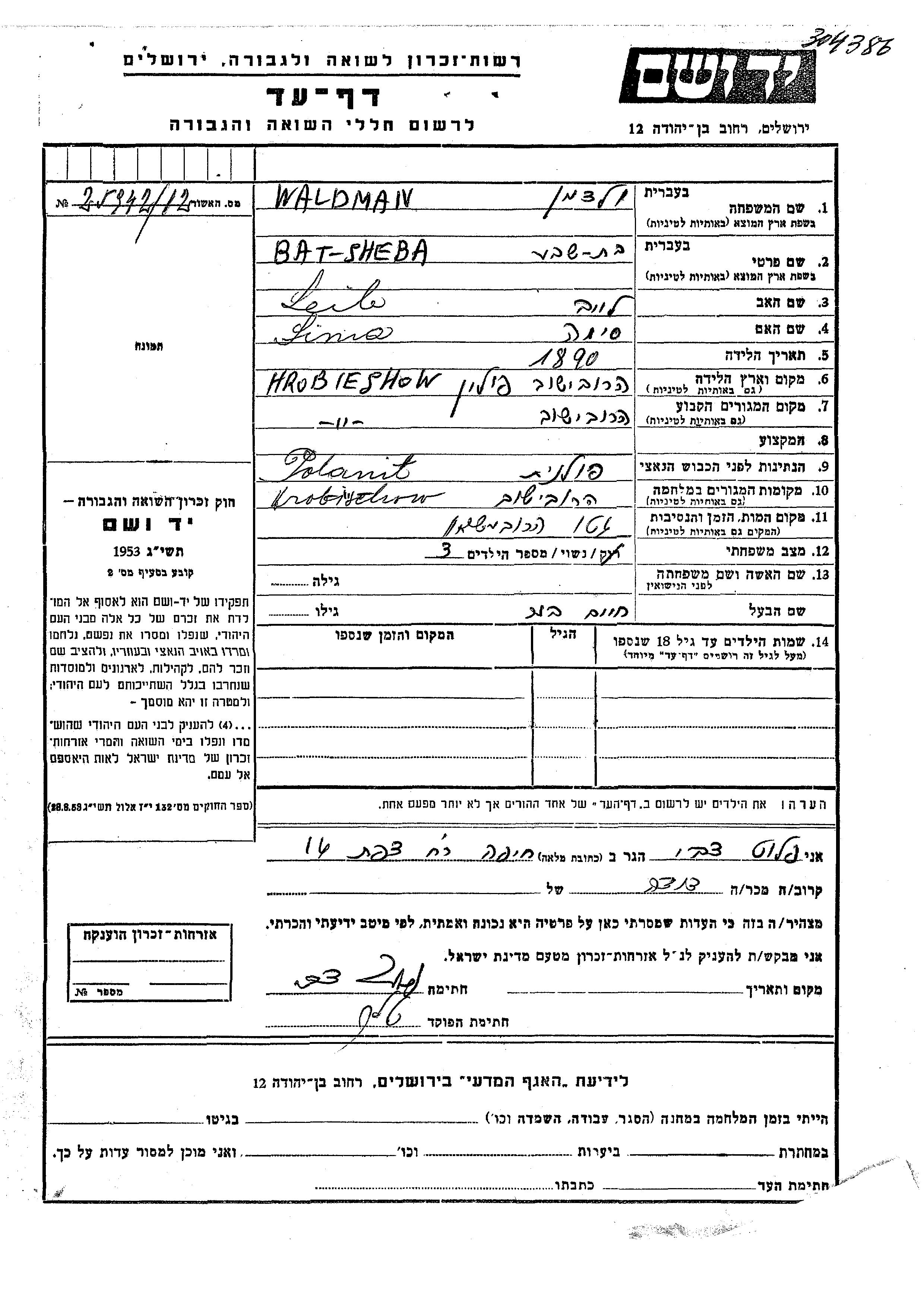 Бат Шеба Вальдман, место рождения: Хрубешув, Польша. Отец: Лейб, mать:Сима. Женат / замужем. Место жительства до войны: Хрубешув, Польша. Место во время войны: Хрубешув, Польша.