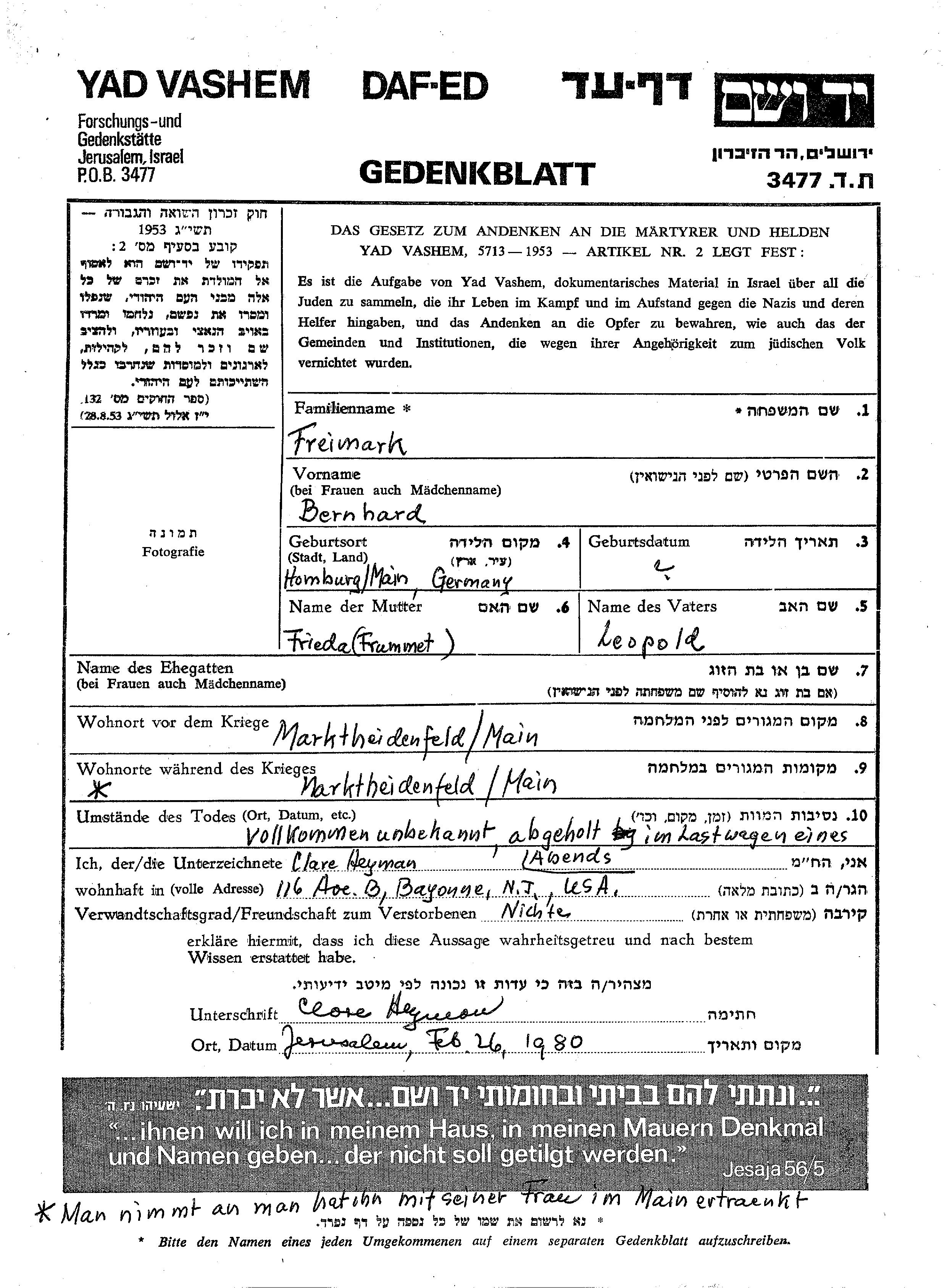 Бернхард Фреймарк, место рождения: Хомбург, Германия. Отец: Леопольд, mать:Фрида Фруммет. Место жительства до войны: Марктхейденфельд, Германия. Место во время войны: Марктхейденфельд, Германия.