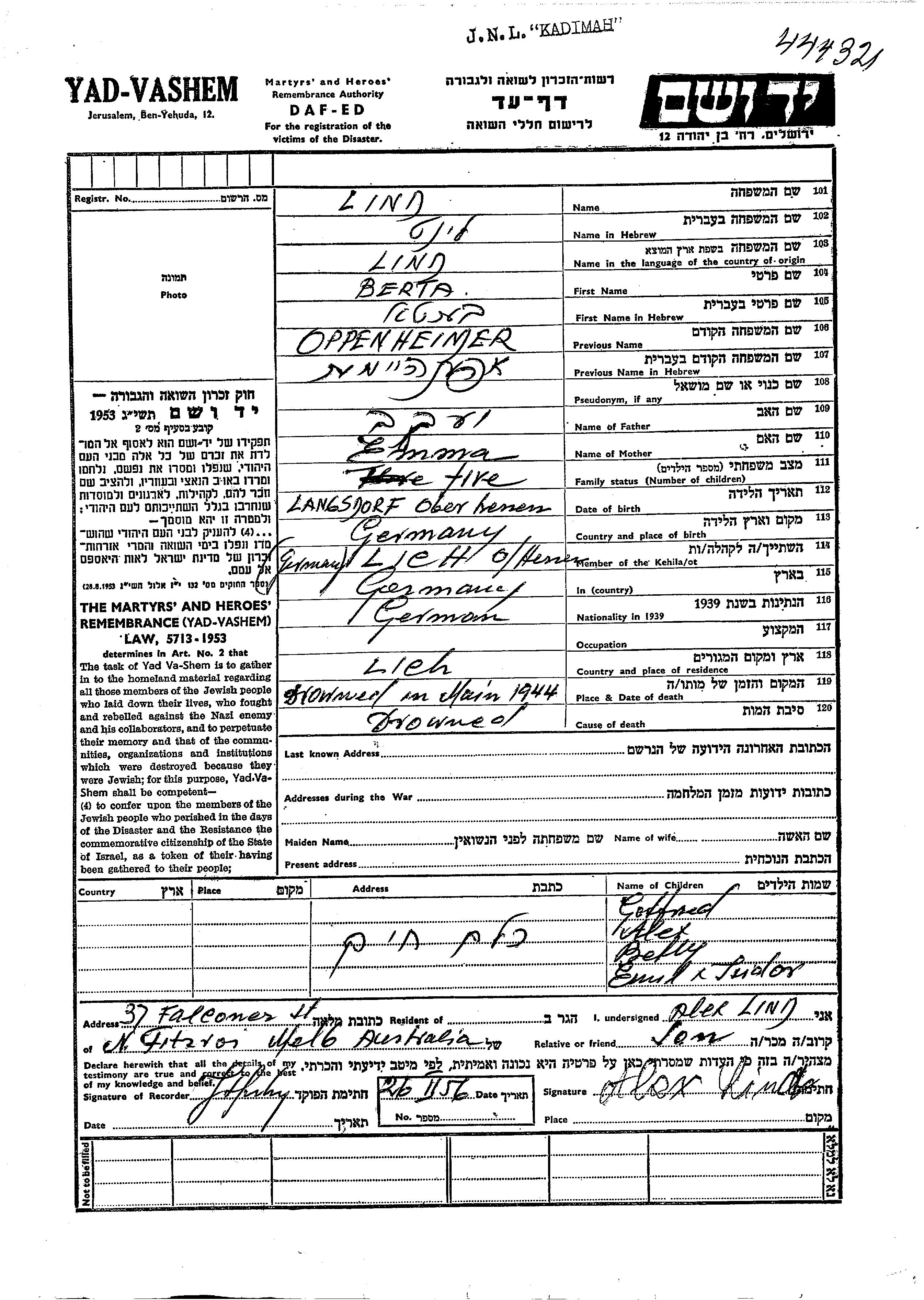 Берта Линд, девичья фамилия Оппенхаймер, место рождения: Лангсдорф, Германия. Отец: Яков, mать:Эмма. Место жительства до войны: Лих, Германия.