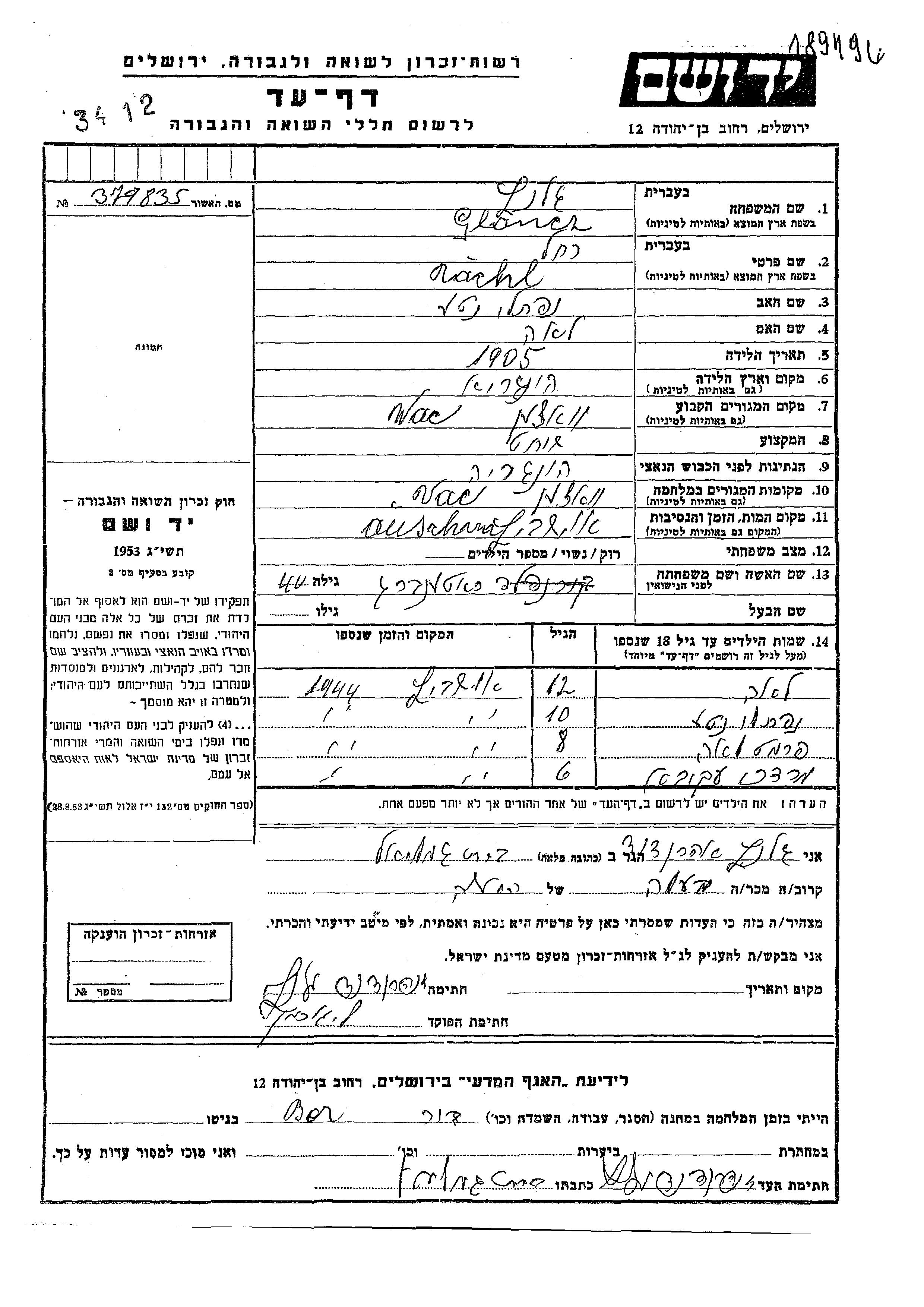 Рахл Гланч, девичья фамилия Ротенберг, место рождения: Венгрия. Отец: Нафтали Нуте, mать:Лея. Резник. Женат / замужем. Место жительства до войны: Вац, Венгрия. Место во время войны: Вац, Венгрия.