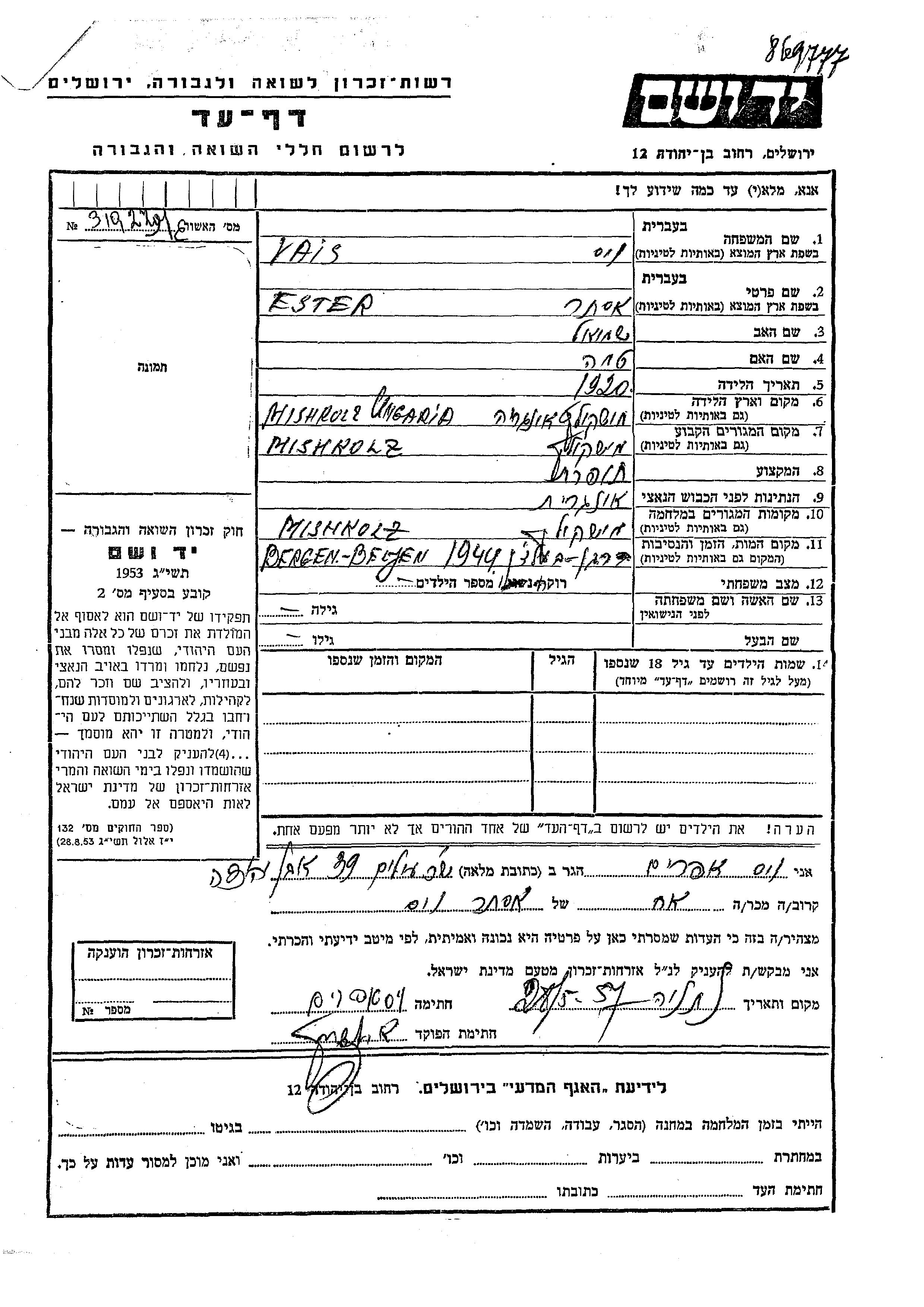 Эстер уничтоженa в период Шоа. место смерти: Берген-Бельзен, Германия в 1944.