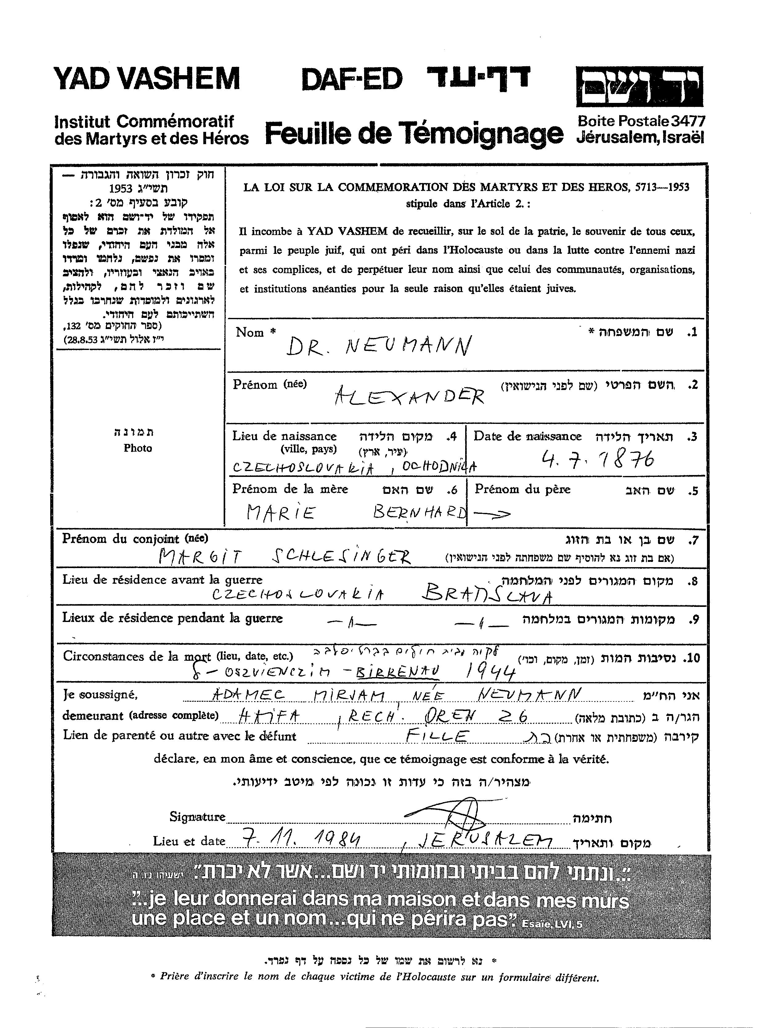 Др. Александер Нойманн, место рождения: Оходница, Польша. Отец: Бернхард, mать:Мари. Женат / замужем. Место жительства до войны: Братислава, Чехословакия. Место во время войны: Братислава, Чехословакия.