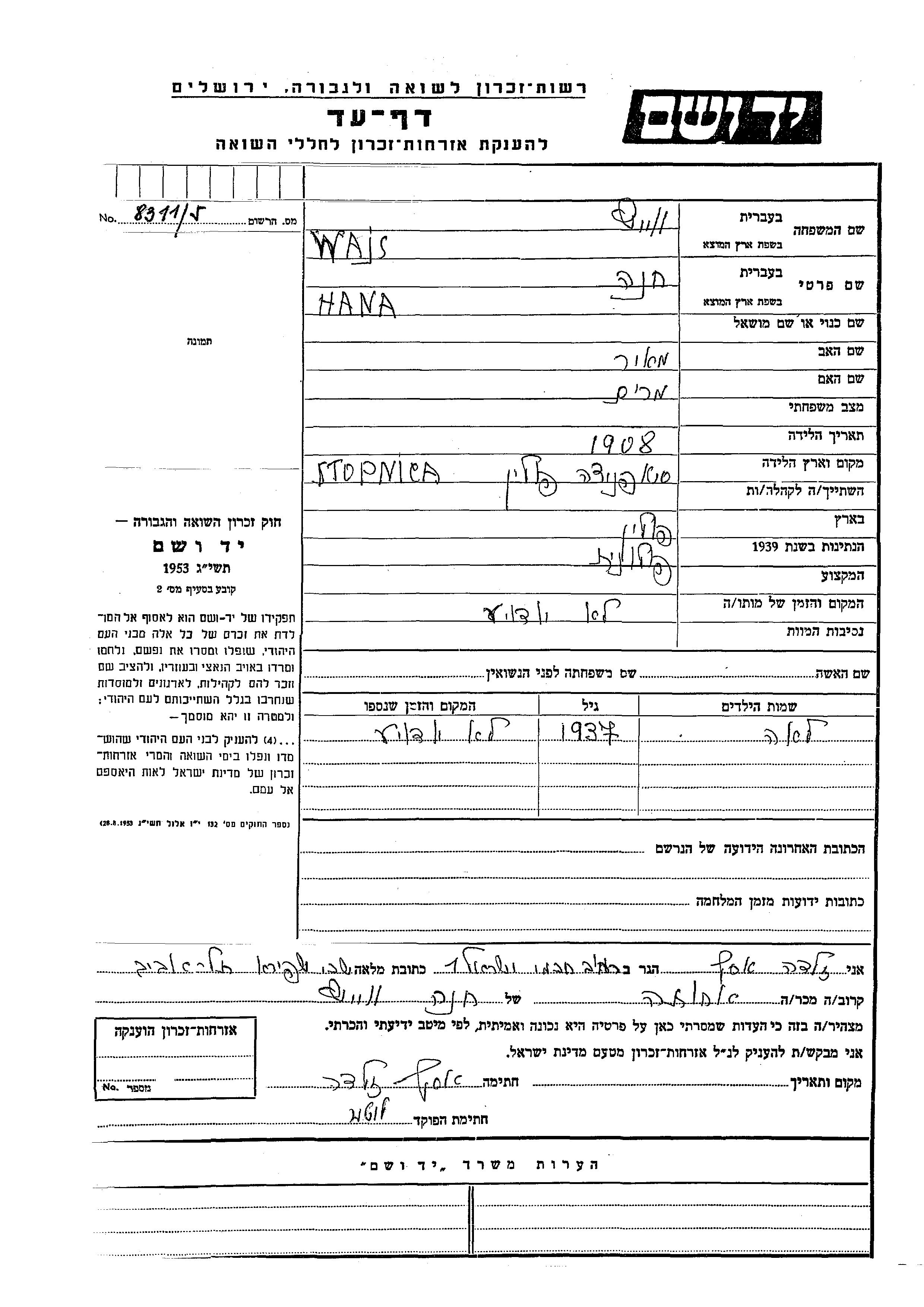 Хана Вайс, место рождения: Стопница, Польша. Отец: Меир, mать:Мирьям. Женат / замужем.