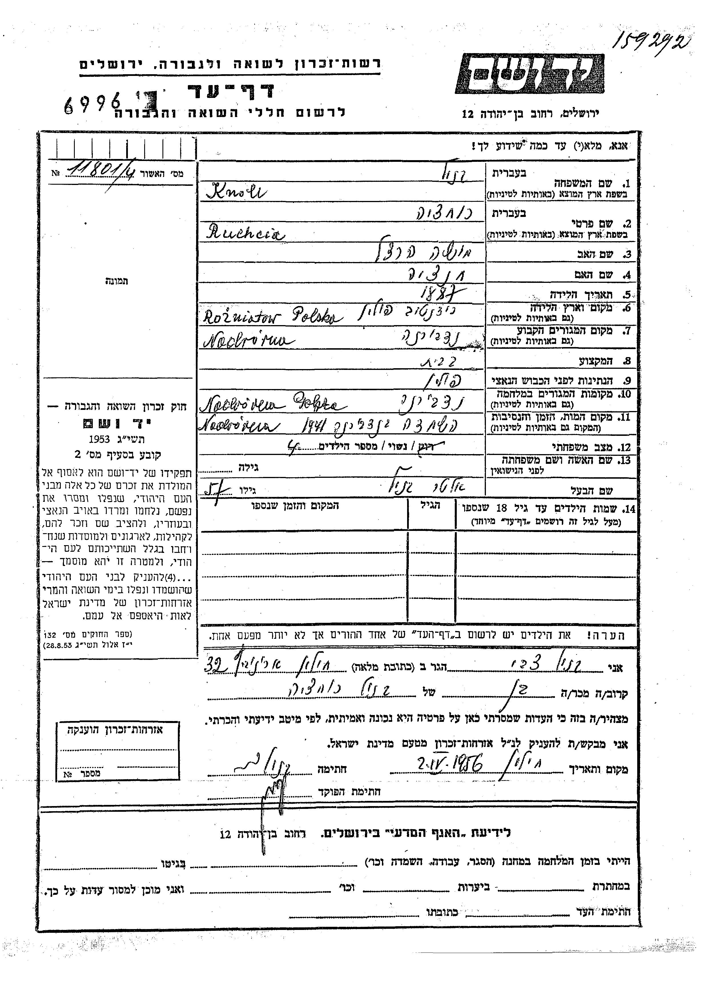 Рухча Кнолль, место рождения: Рожнятув, Польша. Отец: Моше Херцль, mать:Ханця. Домохозяйка. Женат / замужем. Место жительства до войны: Надворная, Польша. Место во время войны: Надворная, Польша.