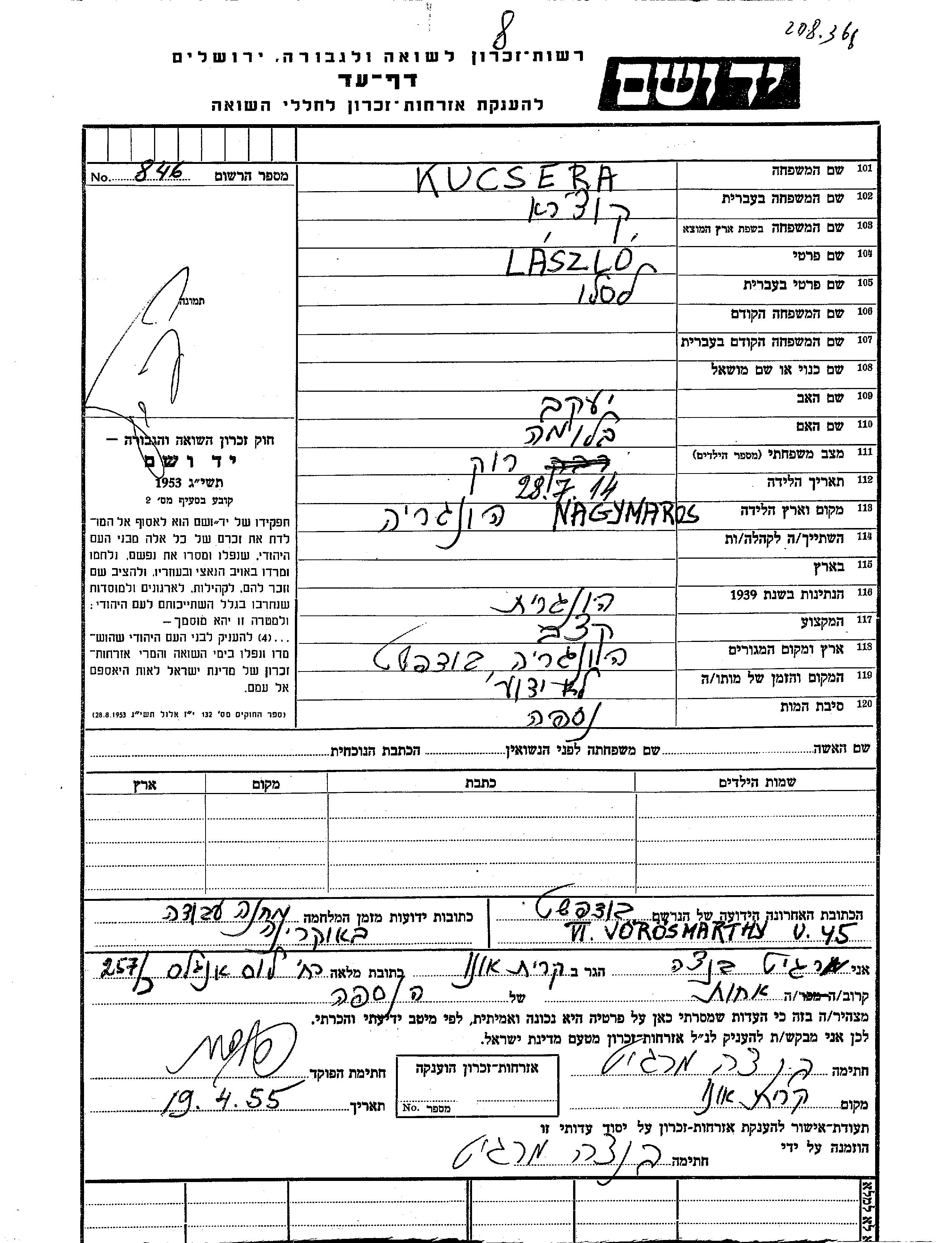 Ласло Кучера, место рождения: Надьмарош, Венгрия. Отец: Яков, mать:Блюма. Мясник. Холост / не замужем. Место жительства до войны: Будапешт, Венгрия.