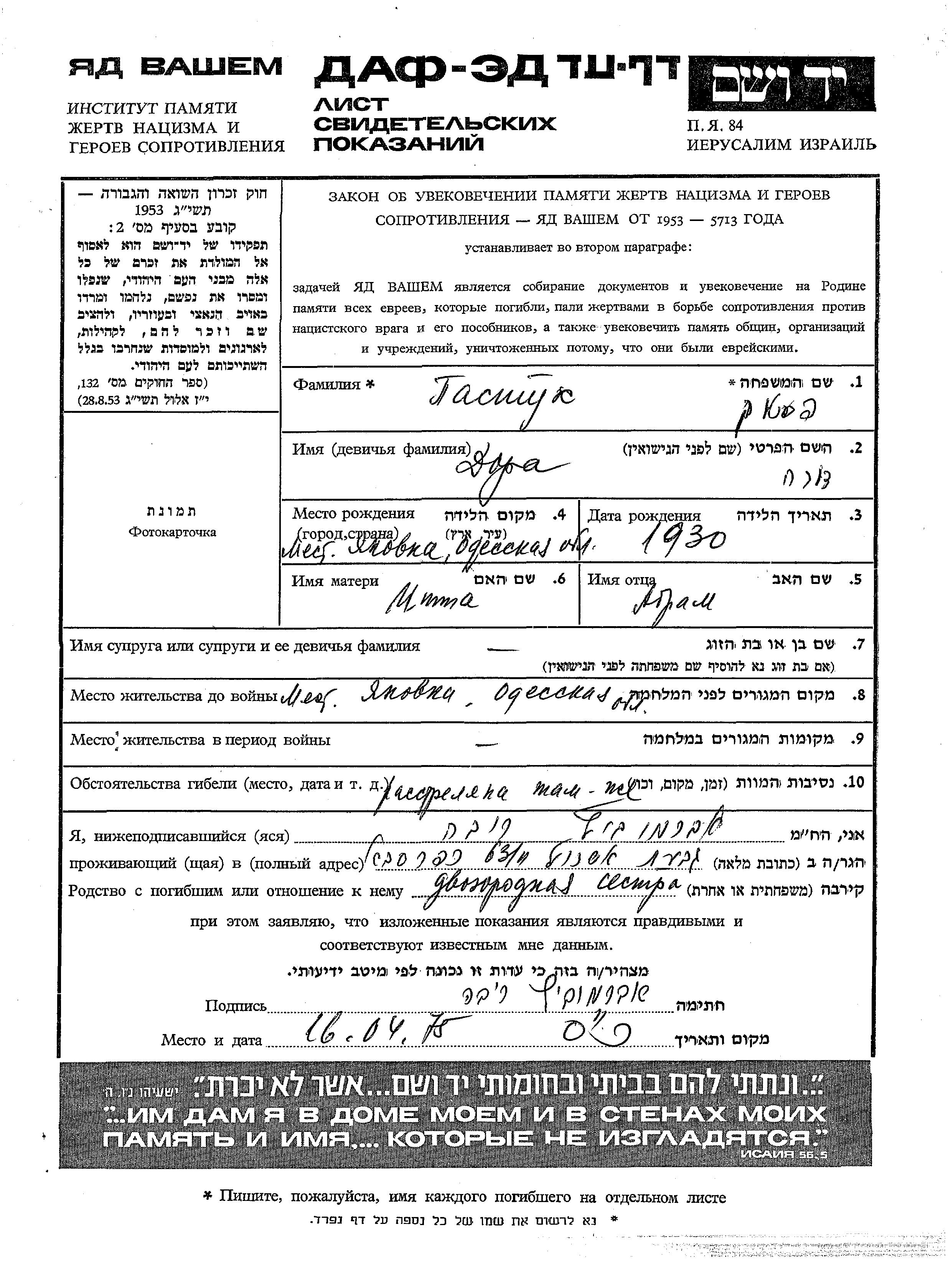 Пастух Дора 1930 Яновка, Украина (СССР) Лист свидетельских показаний